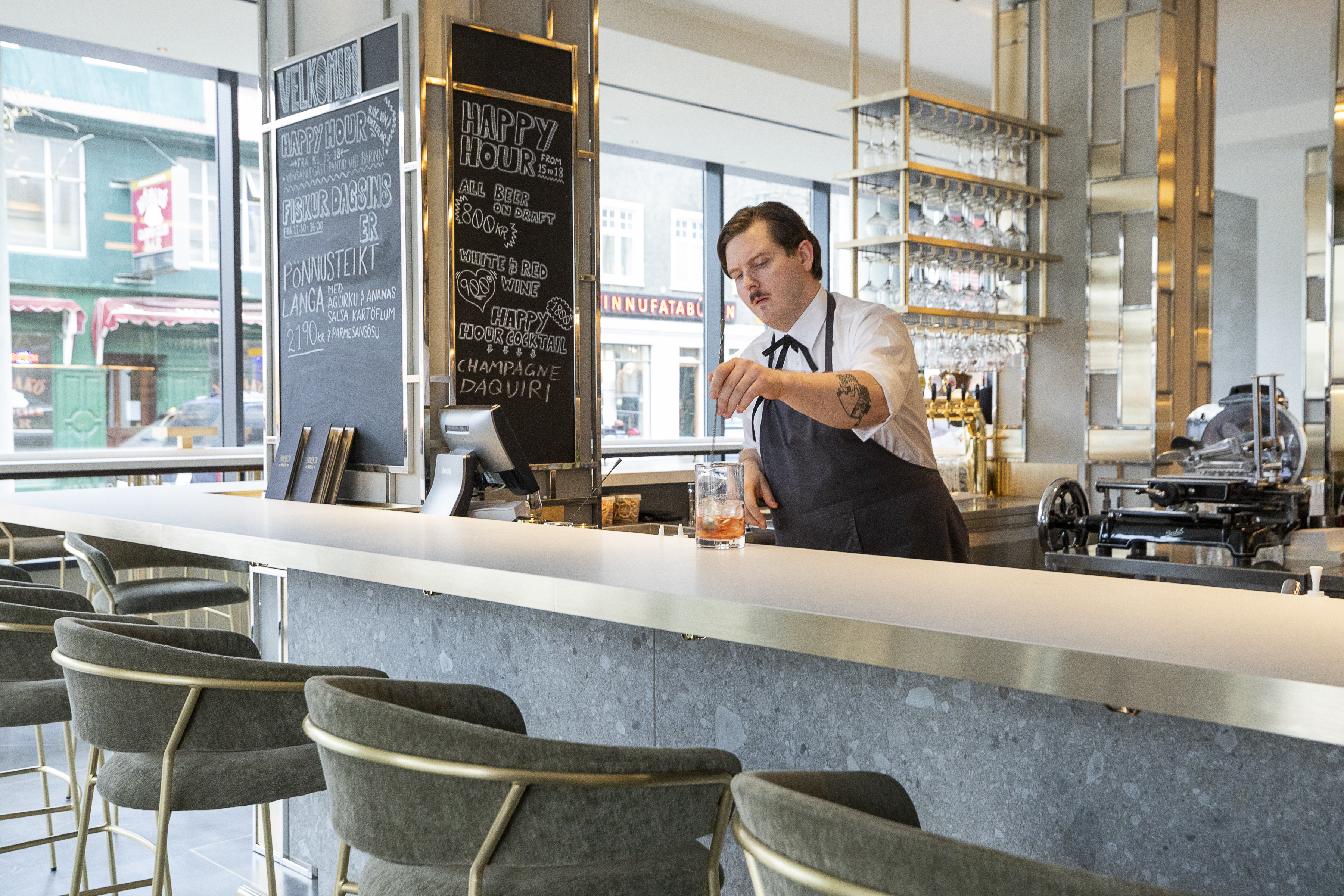 This sleek, spacious bar and restaurant picks up where the late and lamented Skelfiskmarkaðurinn left off. Rather than seafood, the central menu item here is truffles—you can have them on pasta, pizza, or in the signature cocktail range. When we dropped by, it was just before 6pm, and a happy hour champagne cocktail, a Kaldi, and a baked camembert came in at just over 3,000 ISK. We’re curious to try the full menu.