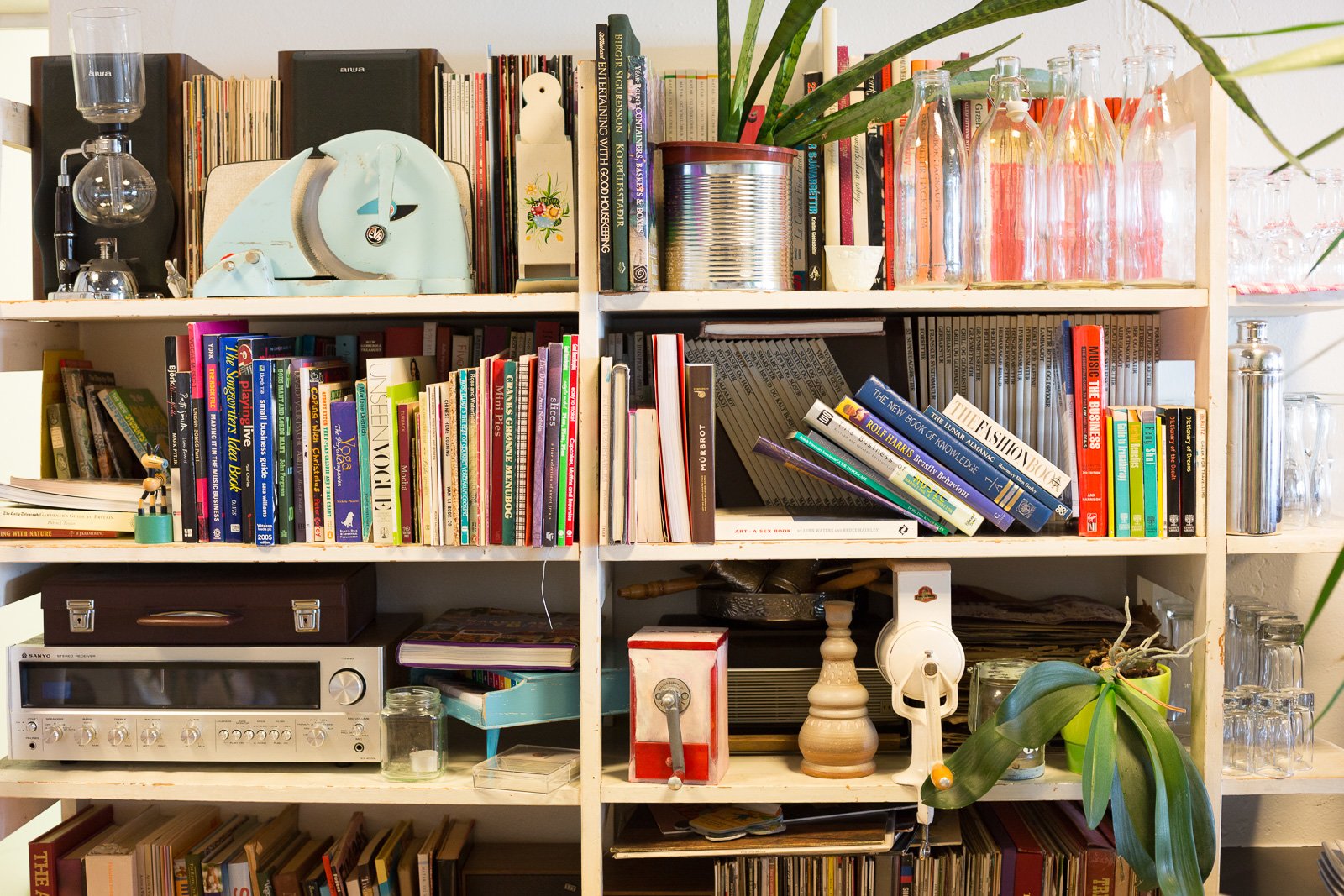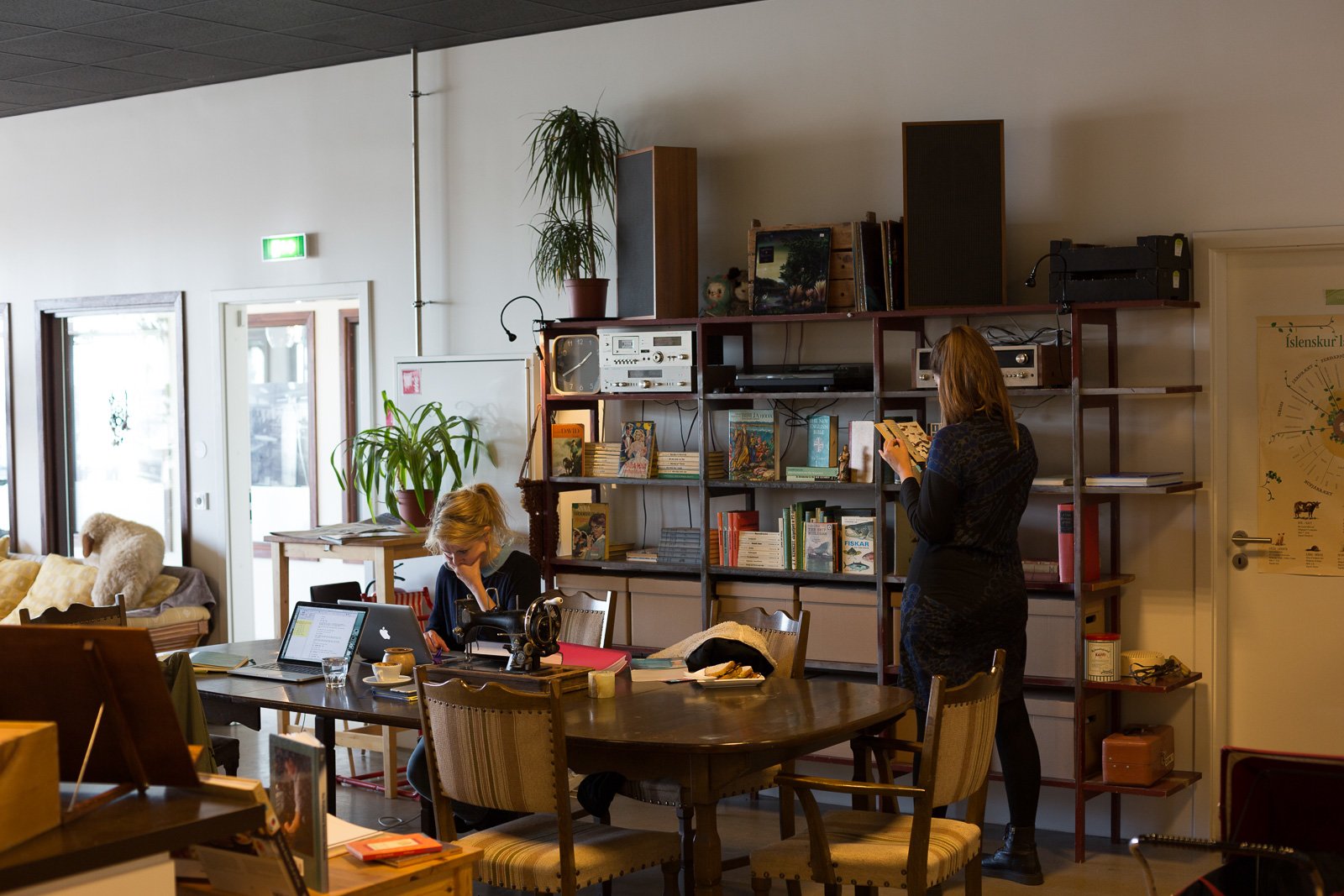 Set back from the harbour road in Hafnarfjörður—the first suburb that people pass through on the way into Reykjavík—is an unassuming café called Pallett. Its single large, airy room has a calm, domestic feel, lined by avocado, coffee and olive plants, and furnished with worn sofas and armchairs, mismatched tables and chairs, shelves containing a wide range of fascinating books, and the kind of vintage knick-knacks you might expect to find in an traditional Icelandic living room. The space is subtly divided into several areas, set up to be somewhere you can relax into a sofa with friends, get some work done, or just watch the world go by through the large front windows.