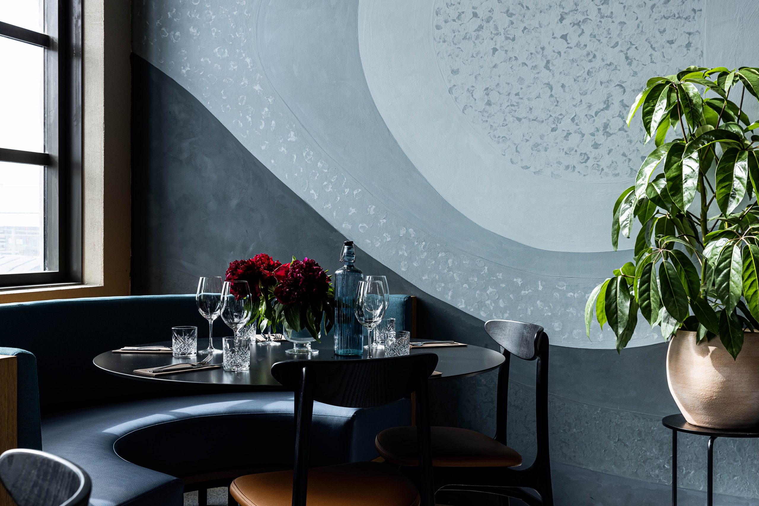 The vestibule allows the right amount of repose to take in the dramatic high ceilings, and chain mesh islands of swank and gloss. Take a moment and scan the landscape for that ideal dining spot—the factory windows spanning three floors, the dusky teal and blue-grey mural or the slinky bar perhaps? There is plenty to choose from, 140 seats to be precise.