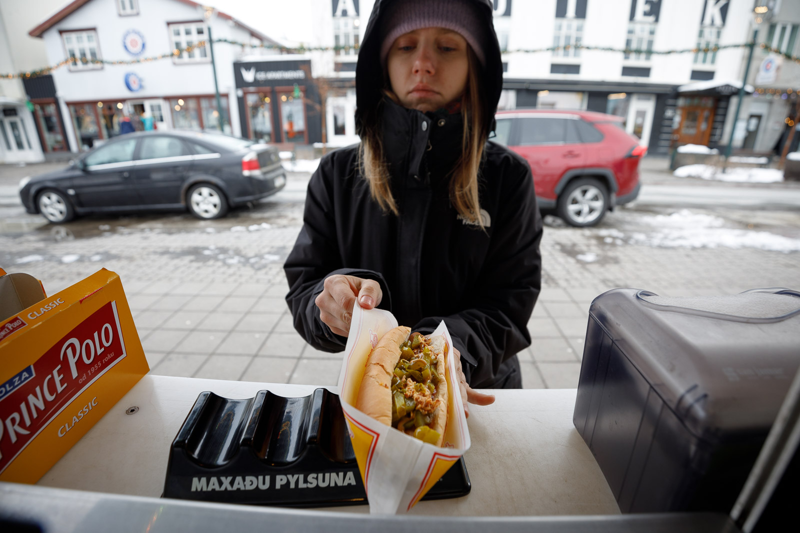 Located on the main street of Akureyri, Pylsuvagninn á Akureyri is hard to miss — its tacky yellow design pops up from afar, contrasting with a bright pink ice cream shop just across the street. Similar to Reykjavík’s Bæjarins Beztu, the stand says “SS pylsur” for the country’s most popular sausages from Sláturfélag Suðurlands. Polish immigrants Agnieszka Kujawska and Tomasz Kujawski bought this hot dog stand ten years ago and despite selling sausages from a local supplier in North Iceland in the beginning, due to customer demand, they succumbed and switched to SS.