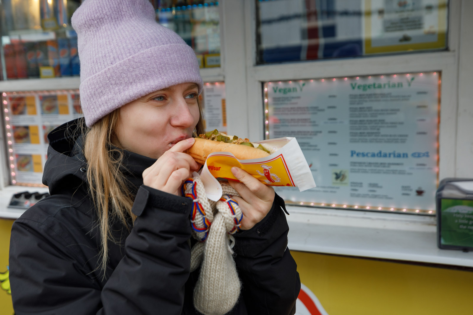 Having waited years to get my hands on a vegan “pylsa,” I’m ecstatic. I devour my hot dog with a plant-based sausage and pickles in record time. The perfectly toasted bun melts in my mouth, the sausage is juicy with a satisfying texture, and the zesty pickles hit the spot. The only downside is eating a hot dog outside in below-zero temperatures.