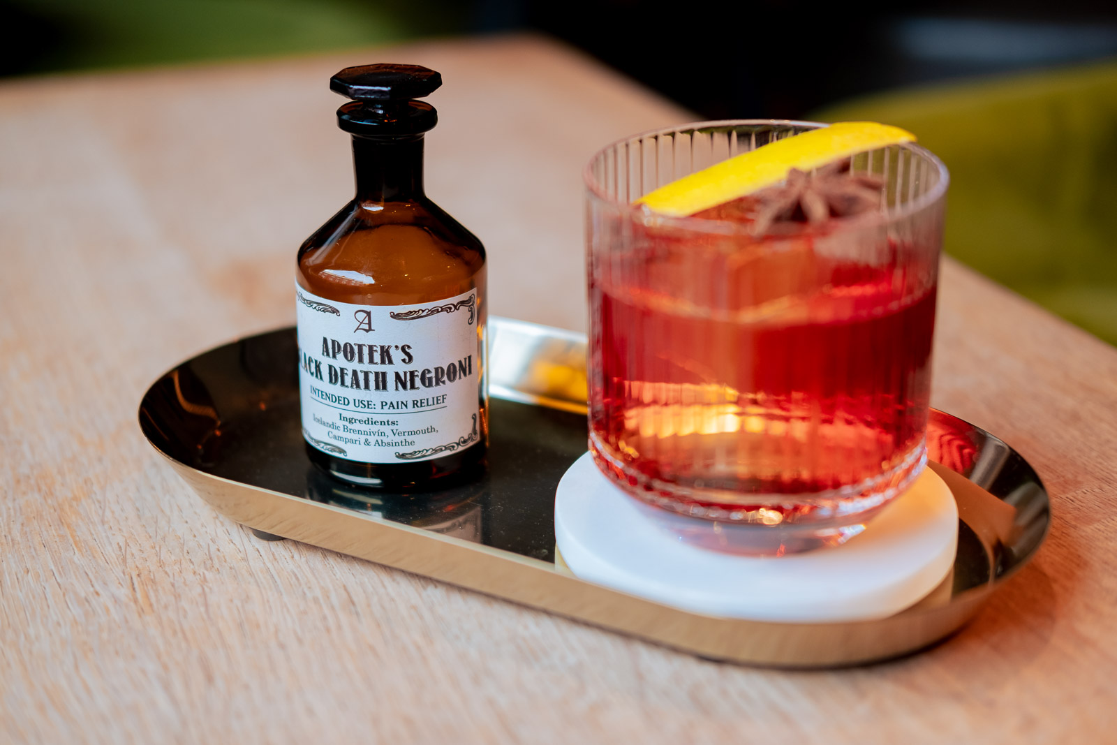 On the first stop of the night, I went for the Black Death Negroni. It arrives in a cute little old-timey medicine bottle, a reference to the pharmacy that stood at this location a century ago. The little brown bottle, the kind that would have held a shot of arsenic to treat your groin blisters back in the day, is now a dainty ready-made blend of Icelandic Brennivín (which used to be marketed under the name of Black Death) a few drops of absinth and the usual negroni business. Brennvín is a tricky ingredient to blend into a cocktail due to its intensive caraway flavour, but Apótek has figured out a way to prove all the nay-sayers wrong. It went down smooth and my groin has never been better.