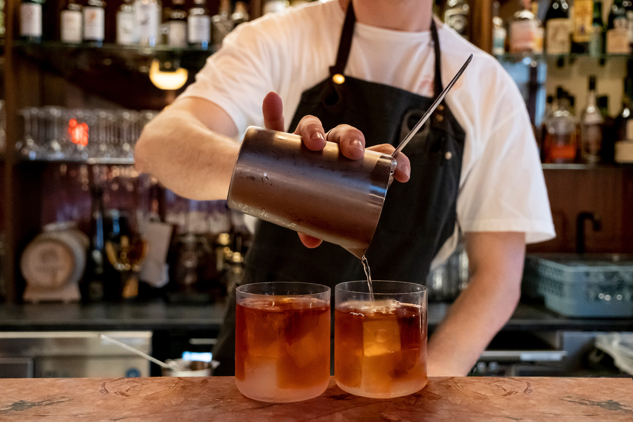 The renovation involved pulling up the floors, adding soundproofing, and upgrading the plumbing, as well as landing on the right aesthetic. “This building is so old!” Jon admits. “It’s from the early 1900s — well over 100 years old now. We’ve gone with a brown and cream interior with the same red wine colour we had at Hlemmur. We’ve kept the marble and brought it over into rose marble. We tried to transfer as many things as we could.”