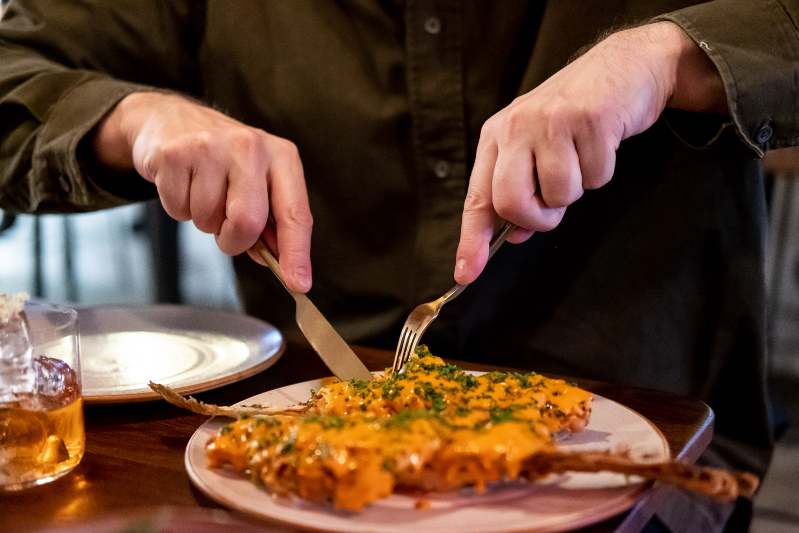 The open kitchen and bar are strongly featured in the restaurant’s layout, with a handful of raised bar seats and some cosy booths with custom-made leather seating. “Part of Skál! was always being able to see inside the whole process,” says Jon. “So our bartender is very exposed. He’s kind of the central point of the main room.” He gestures towards the bar. “My personal favourites are these two tables. You’ve got a lovely street window, you can see into the kitchen and you have the bartender. For me, these are the perfect seats.”