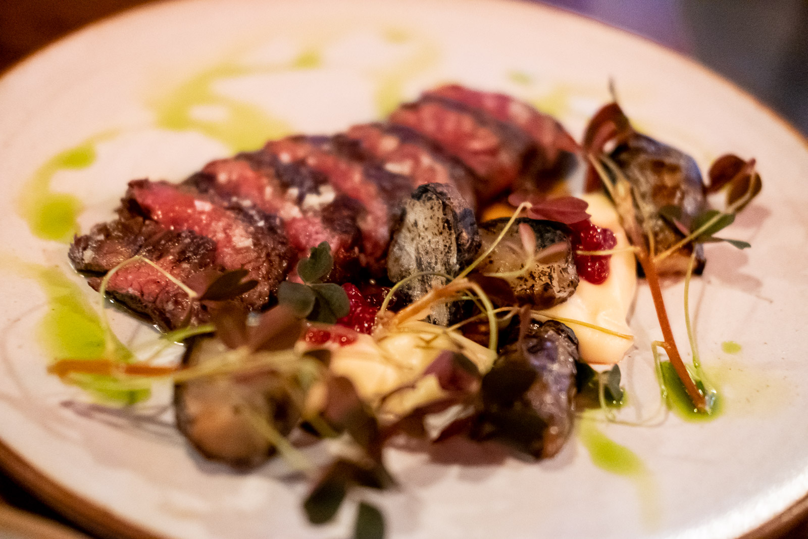 Even the vegetarian pauses to admire the presentation of the hanger steak (4.850 ISK), served sliced to reveal both the ragged, seared edge and the rare pink core. The flavour has an unexpected caramel-ish note, with charred, smoky sunchokes and a pickled stem garnish setting the whole thing off.