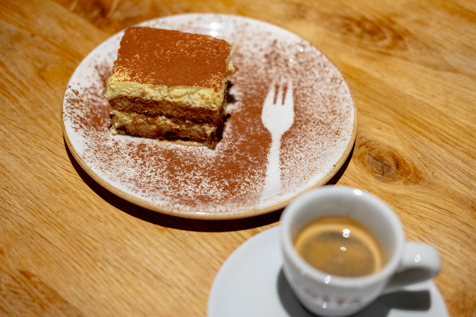 Opting to stick with the basics, we added a tiramisu to round out the order, which didn’t turn any heads. Arriving lopsided, it tasted simultaneously light (think soft meringue and canned whipped cream) while still coating the mouth with a layer of fat. Sweet as a Greek cake, without anything cake-like in its consistency or layers, and only a hint of coffee or booze.