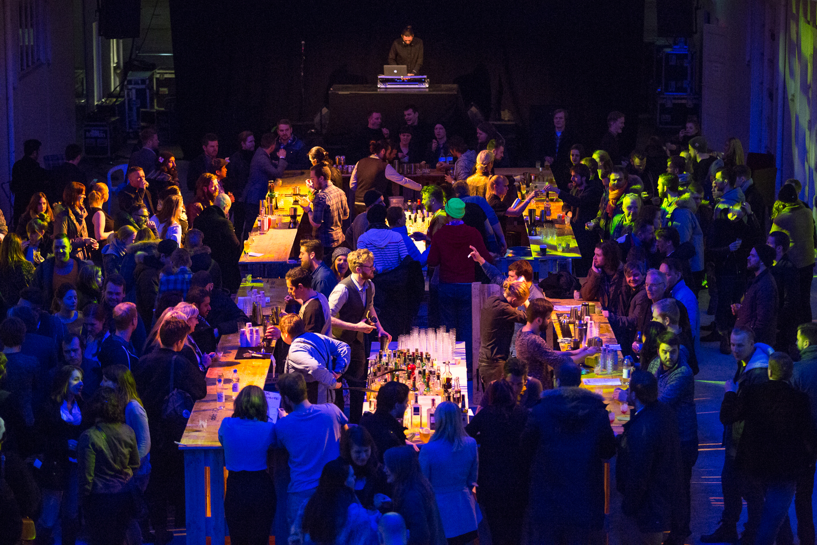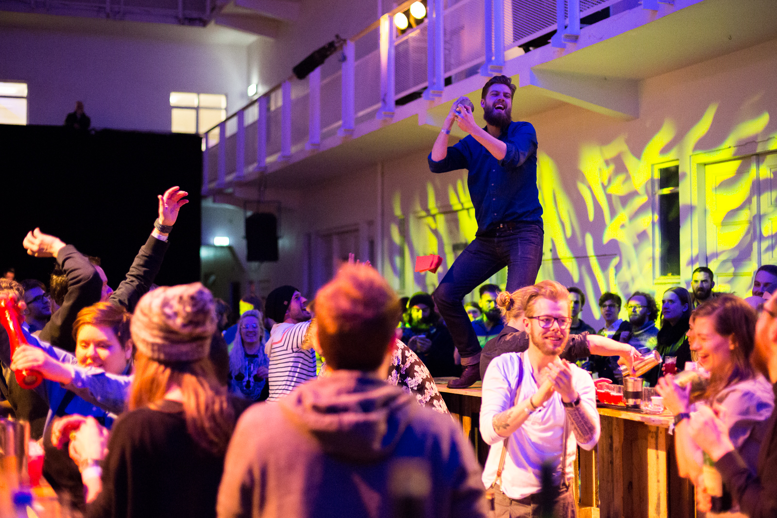 The Reykjavík Art Museum looks like a dystopian prison block and by the end this could have passed for a flamboyant prison riot. Mixologists ripped their shirts off, threw drinks and bottles at each other, formed human pyramids, danced awkwardly, gyrated, all while DJ KGB blasted his records at a volume far exceeding what the sound system could handle (again).