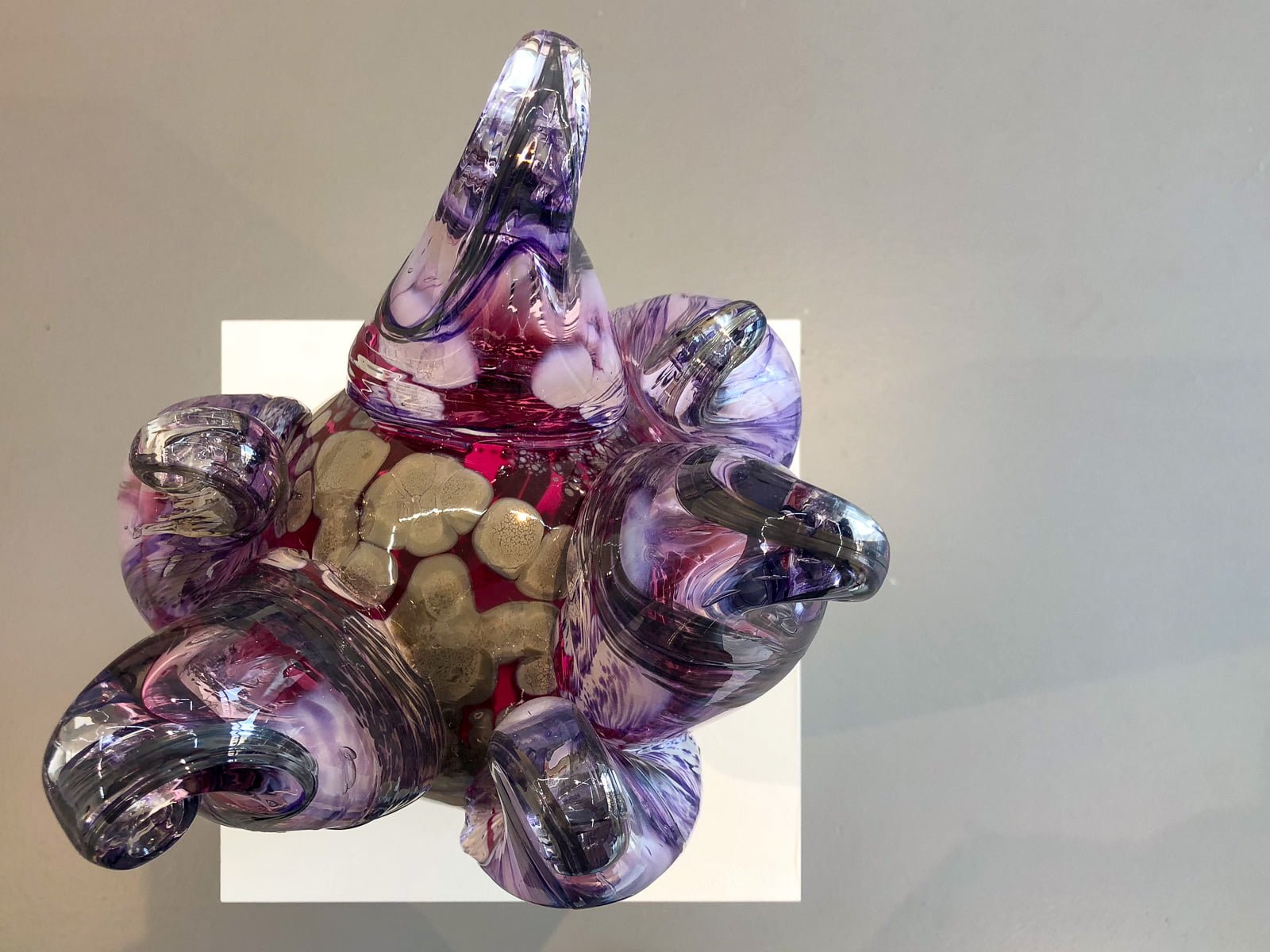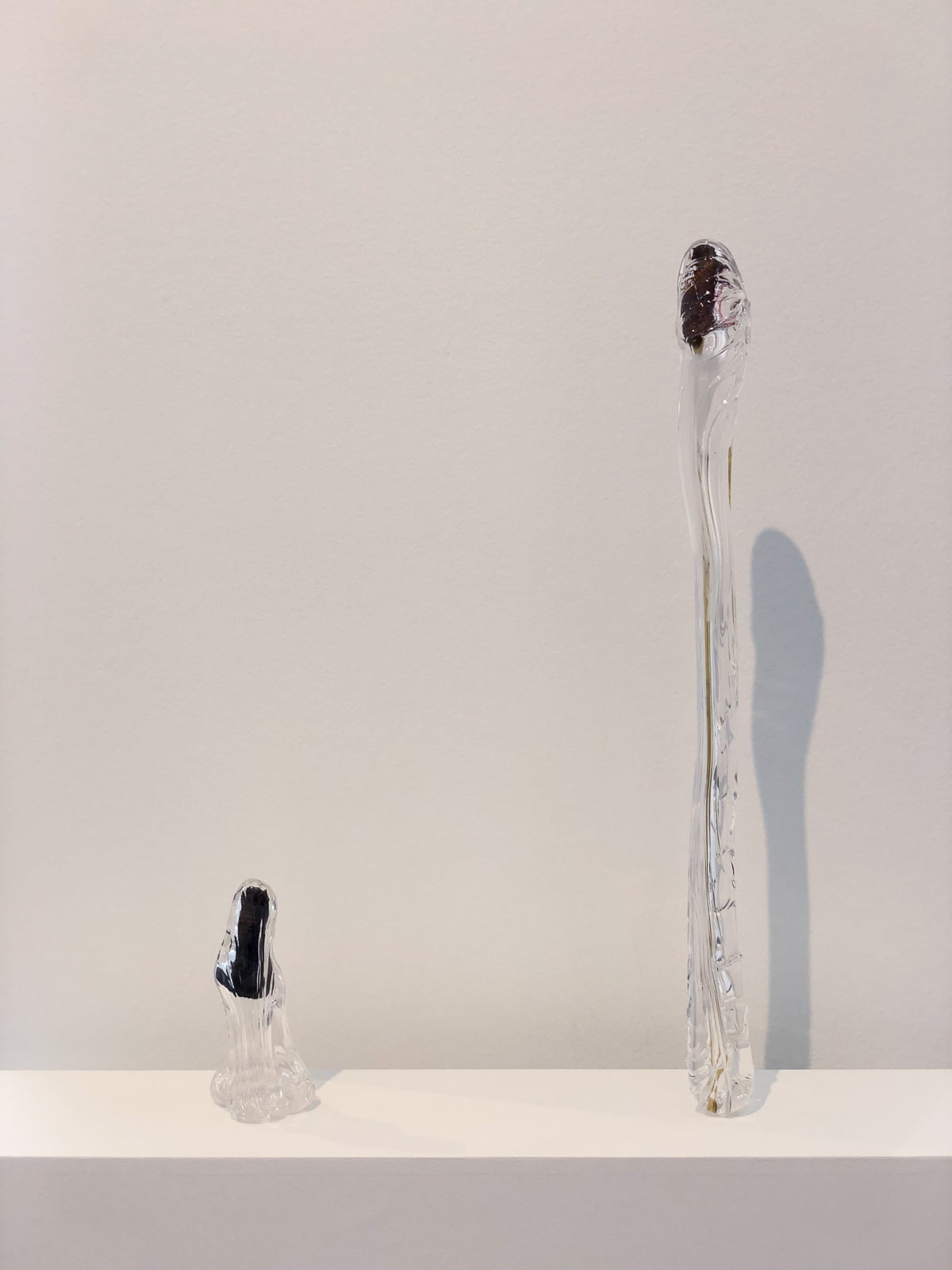 Then there are Kelly Akashi’s rather comically sensual “cast bronze finger sculptures…encased in an almost slapstick viscous drip of blown glass.” Here, physicality is in the forefront once again, whether through the actual digits themselves, or through the viewer’s awareness of the tactile process of creation, “in [the] breath and physicality required to blow the glass.”