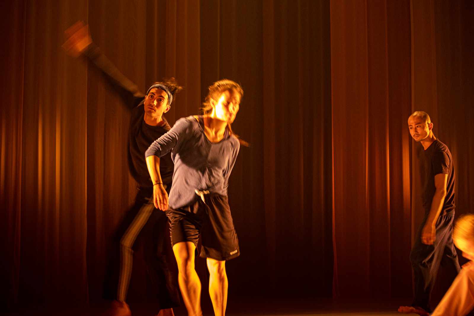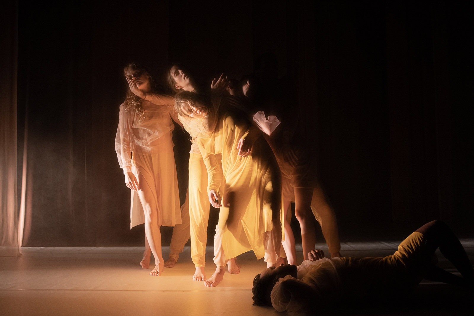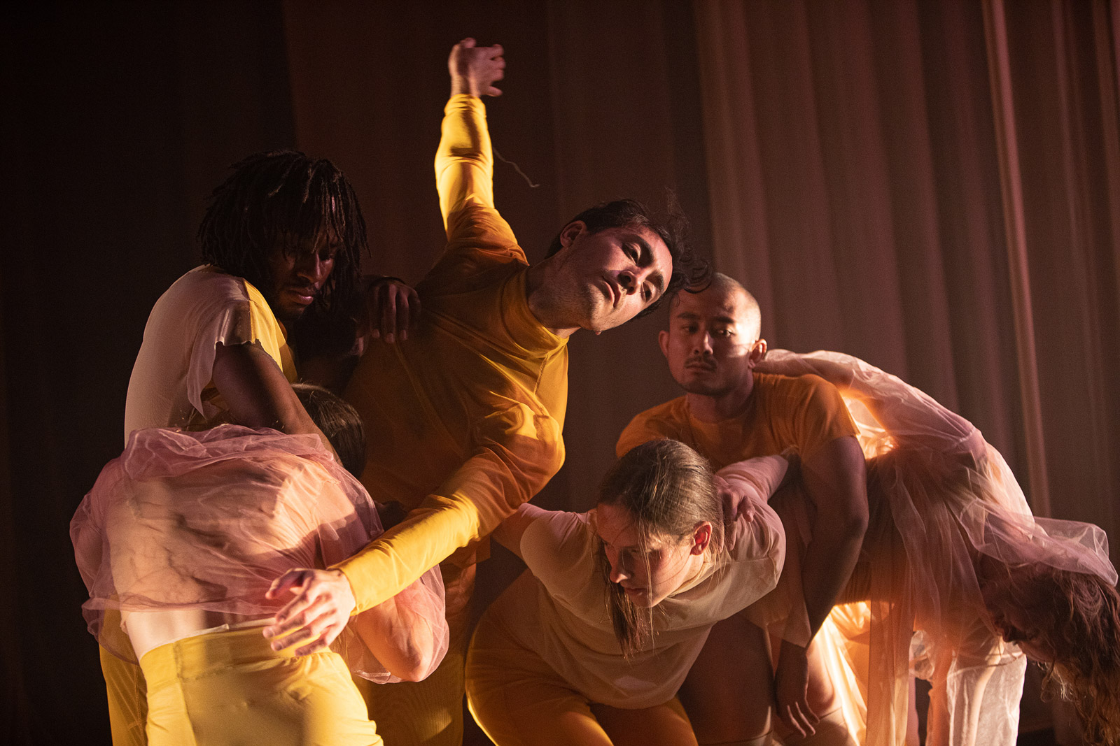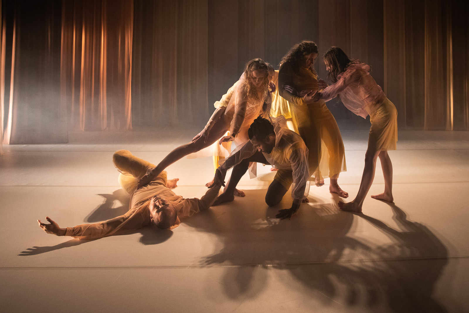 The concepts of entanglement and intimacy tie back in with the importance of touch and physical connection between the dancers throughout the piece. These boundaries and the idea the membrane are portrayed as well through the set design and costuming, with lots of sheer flowing soft fabrics, where the dancers spill between the stage and its limits. The sound design uses recordings of the dancers voices manipulated into ambient drones, an entanglement of the organic and synthetic.