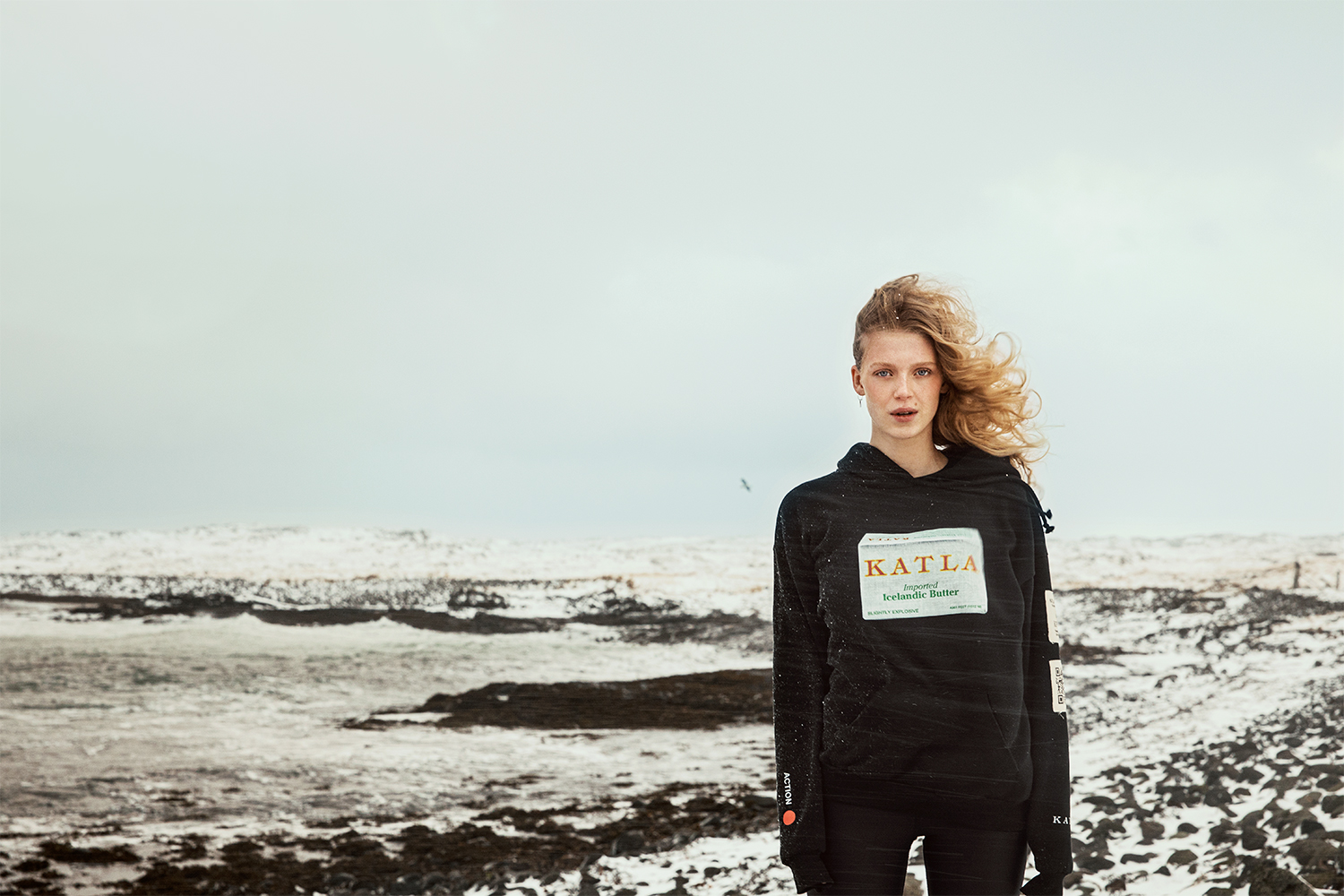 “This was in my home. We had this in our fridge every day,” she says. “The sentence ‘Áfram með smjörið’—I thought, oh my god, yes, that’s hysterical! It’s so Icelandic and it’s so relevant for what Katla is doing.” She smiles. “Take action! Move!”