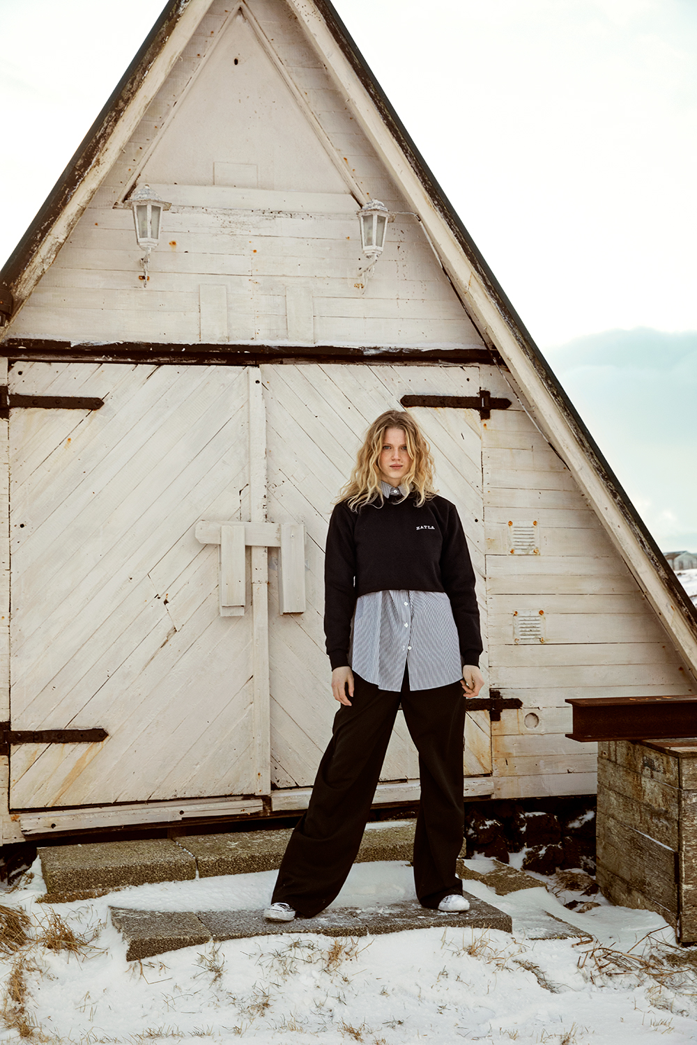Today, she’s wearing a sweatshirt from her new brand Katla, which debuted earlier this year with a mixture of everything from cosy separates to gorgeous flowing sundresses. The print is a play on the traditional Icelandic butter logo; the word smjör being replaced by Katla. On the back reads ‘Áfram með smjörið”—an old Icelandic saying that translates to “On with the butter.”