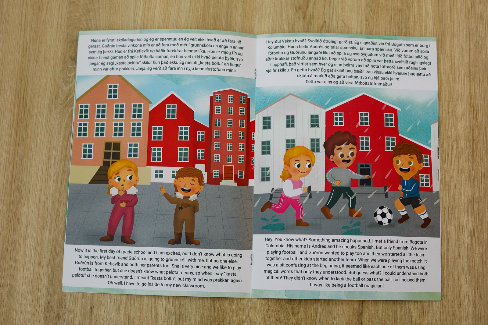 Eventually, in elementary school, Áki Taheil is playing with his Icelandic-speaking friends when a new classmate arrives from Colombia speaking no Icelandic. Being multilingual, Áki Taheil is able to speak with this new classmate and his other classmates, using language as a tool for inclusivity and winning football matches (you’ll have to read the book for that plot point).