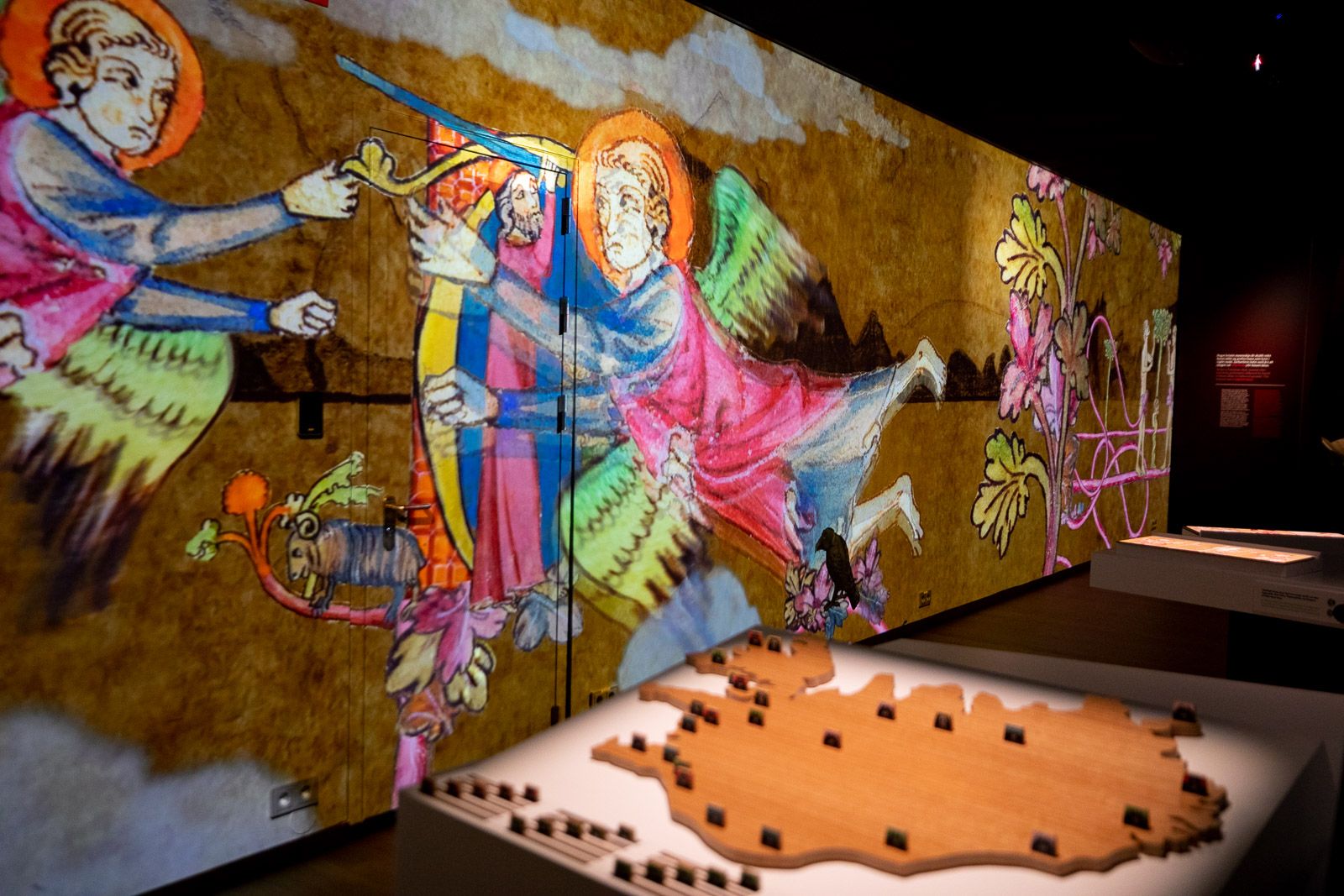 It’s cavernous and dim, with points of interest glowing throughout in soft, warm light. The displays are asymmetrically shaped and connected by benches that invite visitors to stop a moment and soak up the environment. Huge projections fill the longest wall of the room, sliding along in a seemingly endless loop of illustrations taken from the margins of the manuscripts themselves. Men battle, angels fly, and monsters breath fire amongst twisting plants in a hypnotic display.