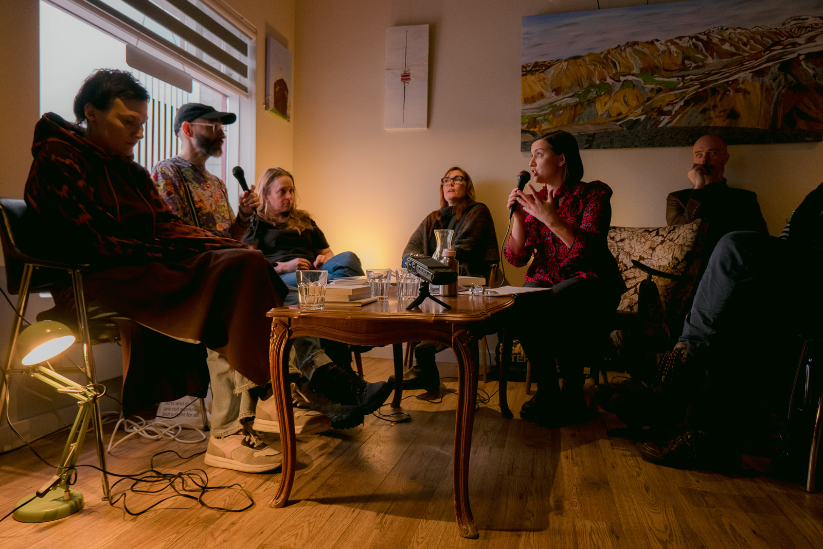 Settling into Bryggjukaffi, my first observation was that I was not the only person with a pen and notebook; many around me would often whip to a page and scribble something (others were endearingly doodling, though). Within this conversation, the authors offered beautiful readings, with a particularly theatrical one from Elías Knörr. Immediately following them was a conversation between long-time collaborators angela and Poet Laureate of Vancouver Elee Kraljii Gardiner. The pair’s conversation flowed effortlessly without pause, and yet we learned within the conversation that it was the first time they had met and spoken in person.