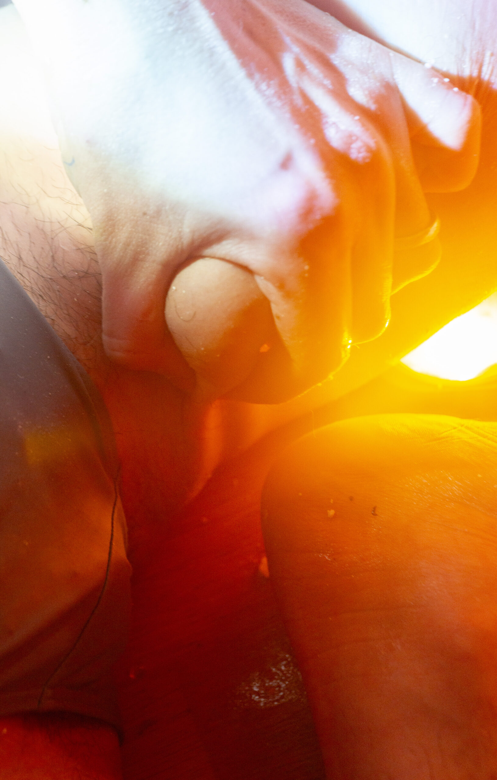 In their artist statement, the two describe that their “collaboration began due to their identical buzzcuts. Their work germinated in long conversations around hair, image, self, a-linearity, and the internet. However, the project itself truly began on a sunny afternoon in May 2024. That day, Jo took their first testosterone dose, and Sadie dipped their foot in slime and snapped a picture with a plastic pink camera.” Sadie echoes this as I ask the two about their work’s inception, and explains, “We bonded over both dressing in trash styles and being bald. Also that we would just mention theory to the other person, and the other person would know what we were talking about.”