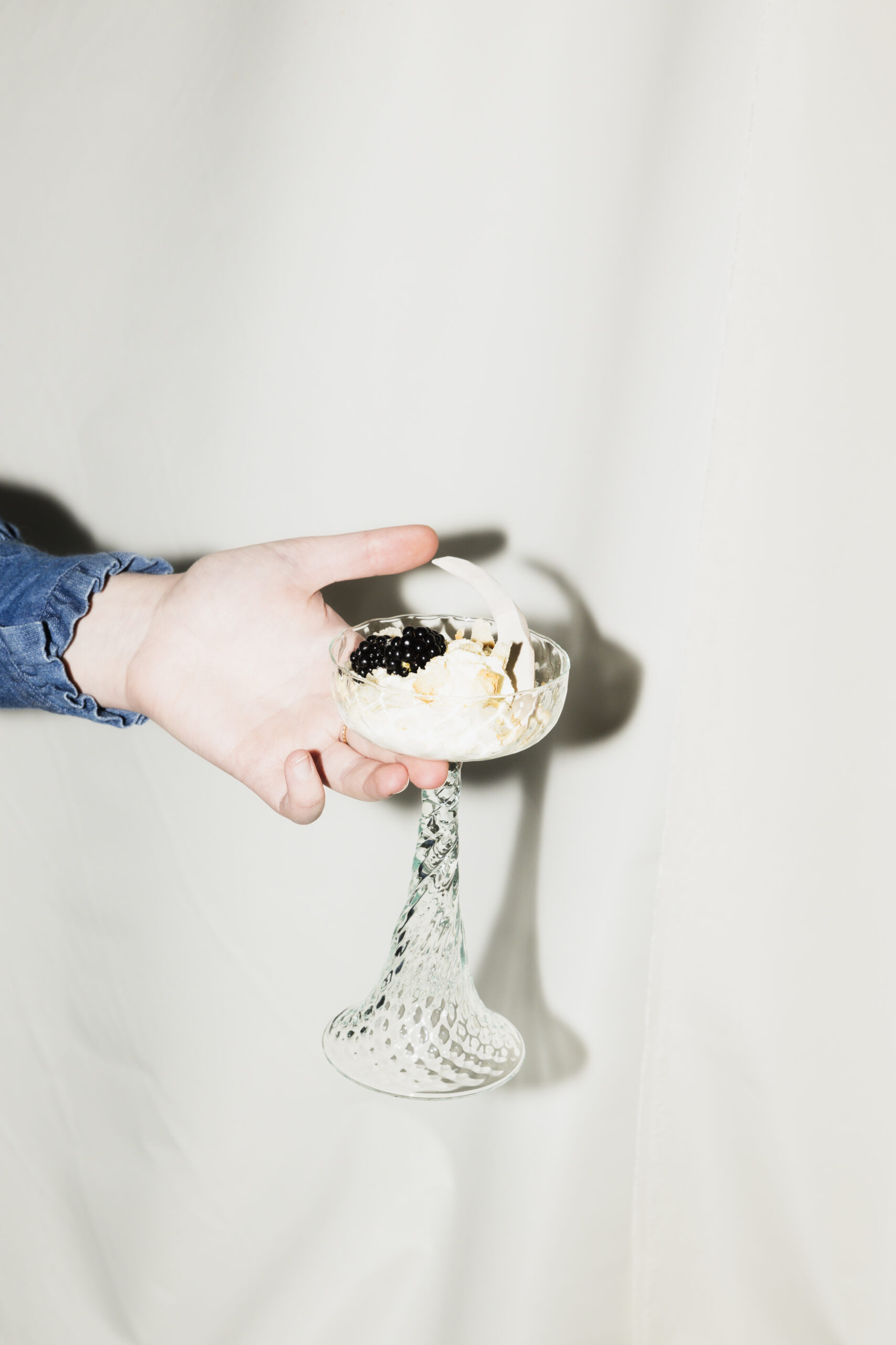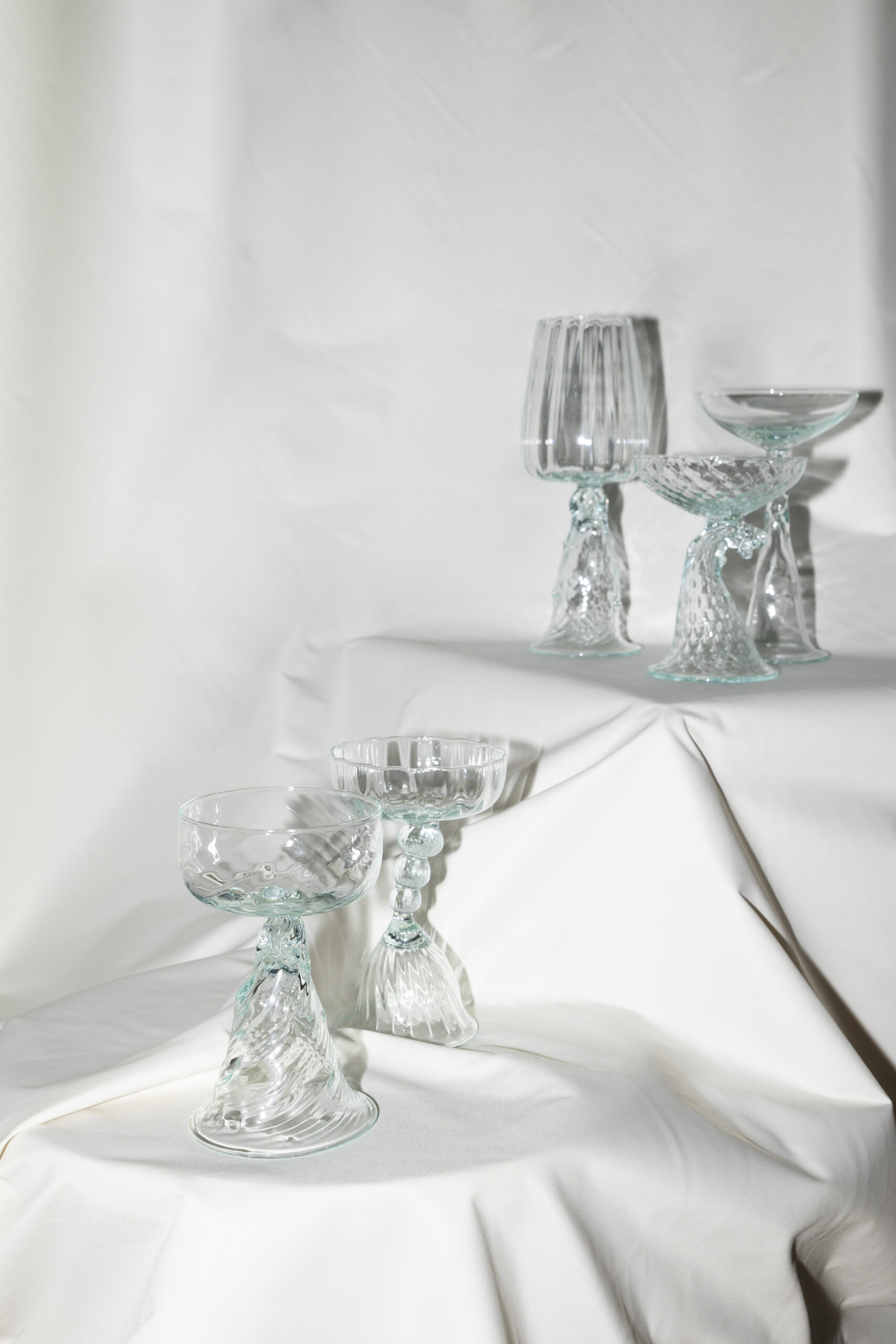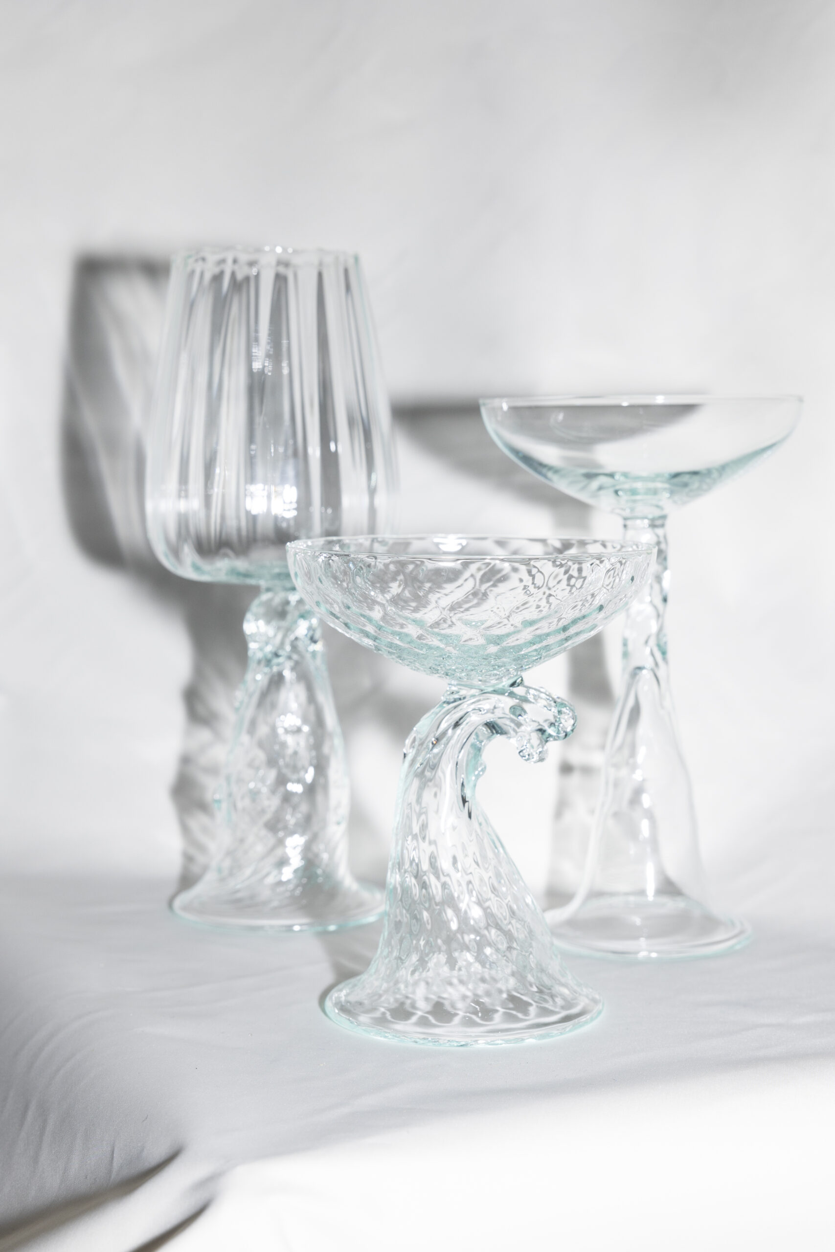 All the glasses are double-ended — you can simply flip them upside down to get a completely new glass. A wine glass turns into a shot glass, or whatever else you want it to be. “We wanted to create lots of different ways to use each piece — the glasses can also be dessert bowls, or used for ice cream, cocktails, olives, anything,” says Berglind.