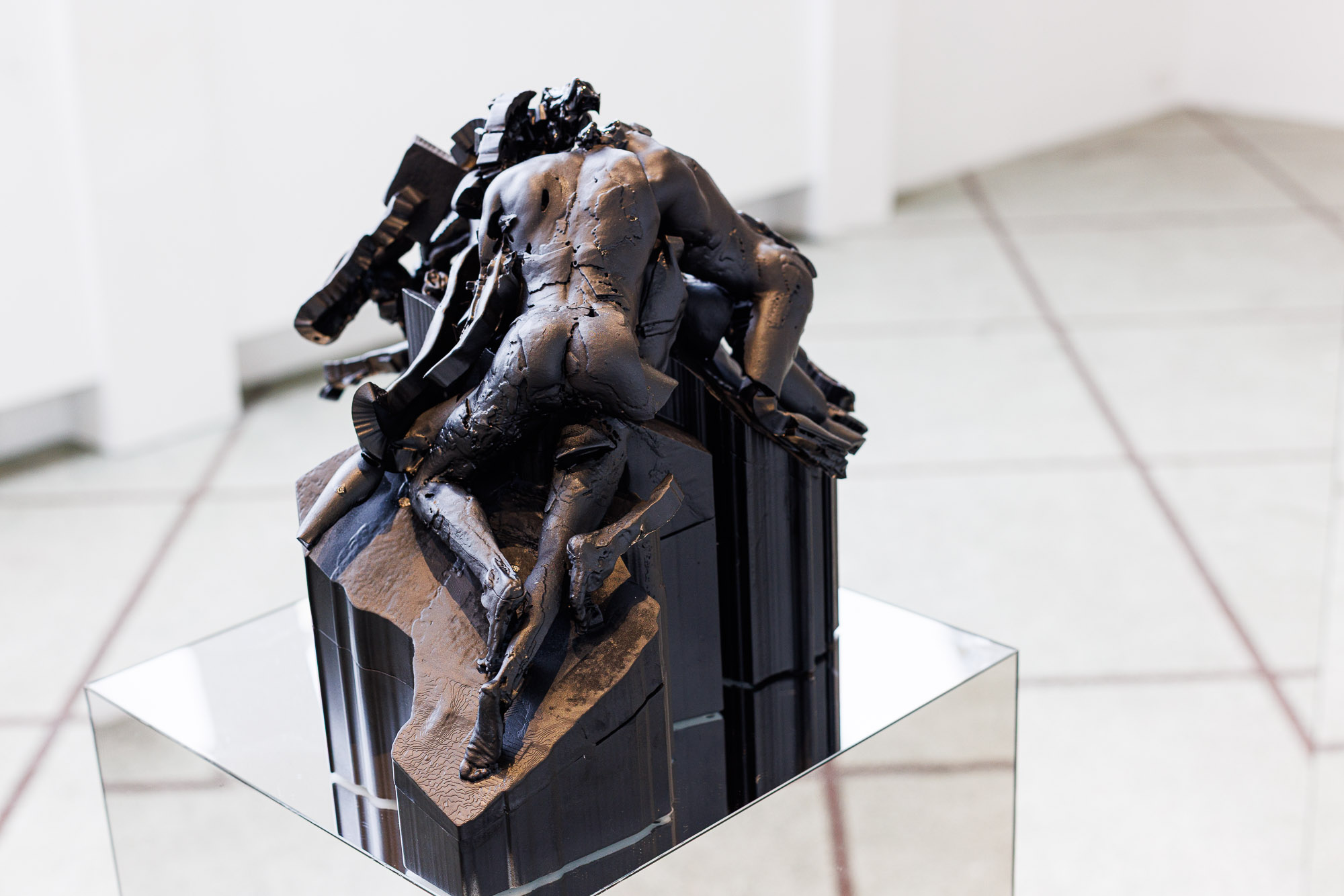 Miles’s sculptures are 3D-printed captures of a group’s movements during an orgy, using a handheld scanner intended for monitoring static industrial parts. There’s a distinctive dynamic quality to the figures in the sculptures, which are technically maquettes, which I learn comes from Miles’s alterations to the tool. “I took away its ability to understand movement, in order for it to just allow the glitches to happen,” he explains. “A big part of the price point is the fact that it can [understand movement]. So, I basically killed off the expensive part,” he laughs, adding, “It creates these 3D meshes that I cannot re-stage. It’s in the same way that when you do a performance, you can’t go backwards.”