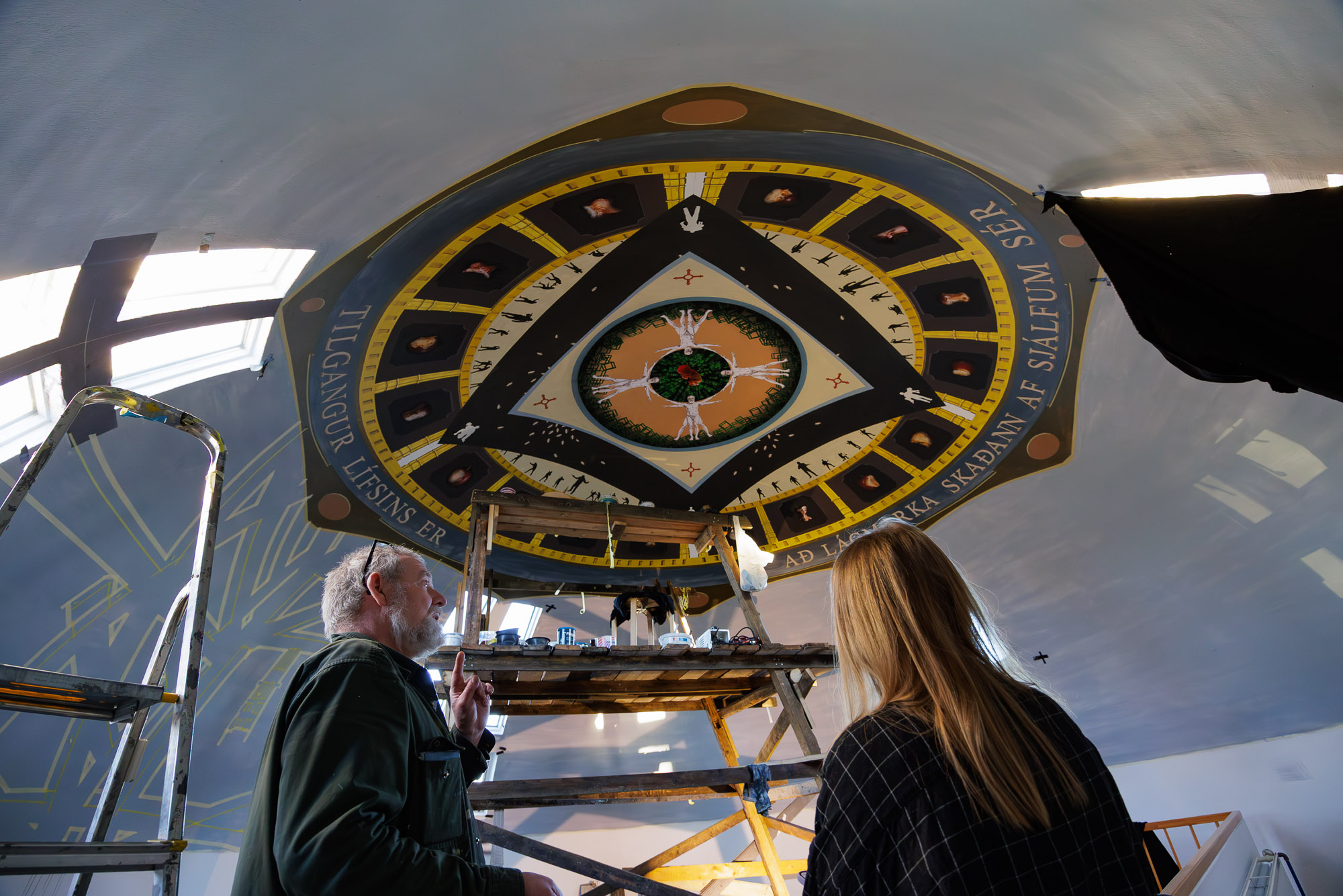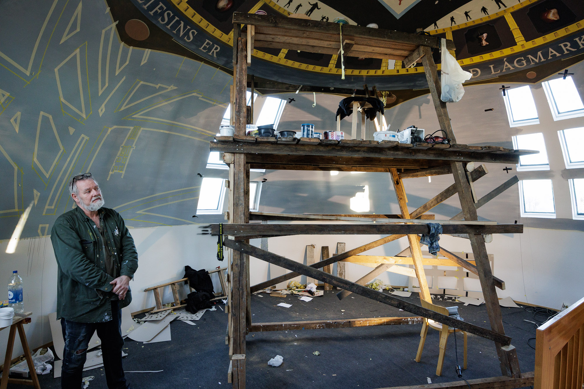 By that, he means a huge dome-shaped structure of Ásmundarsafn itself, where Finnur is painting a cathedral-like dome.