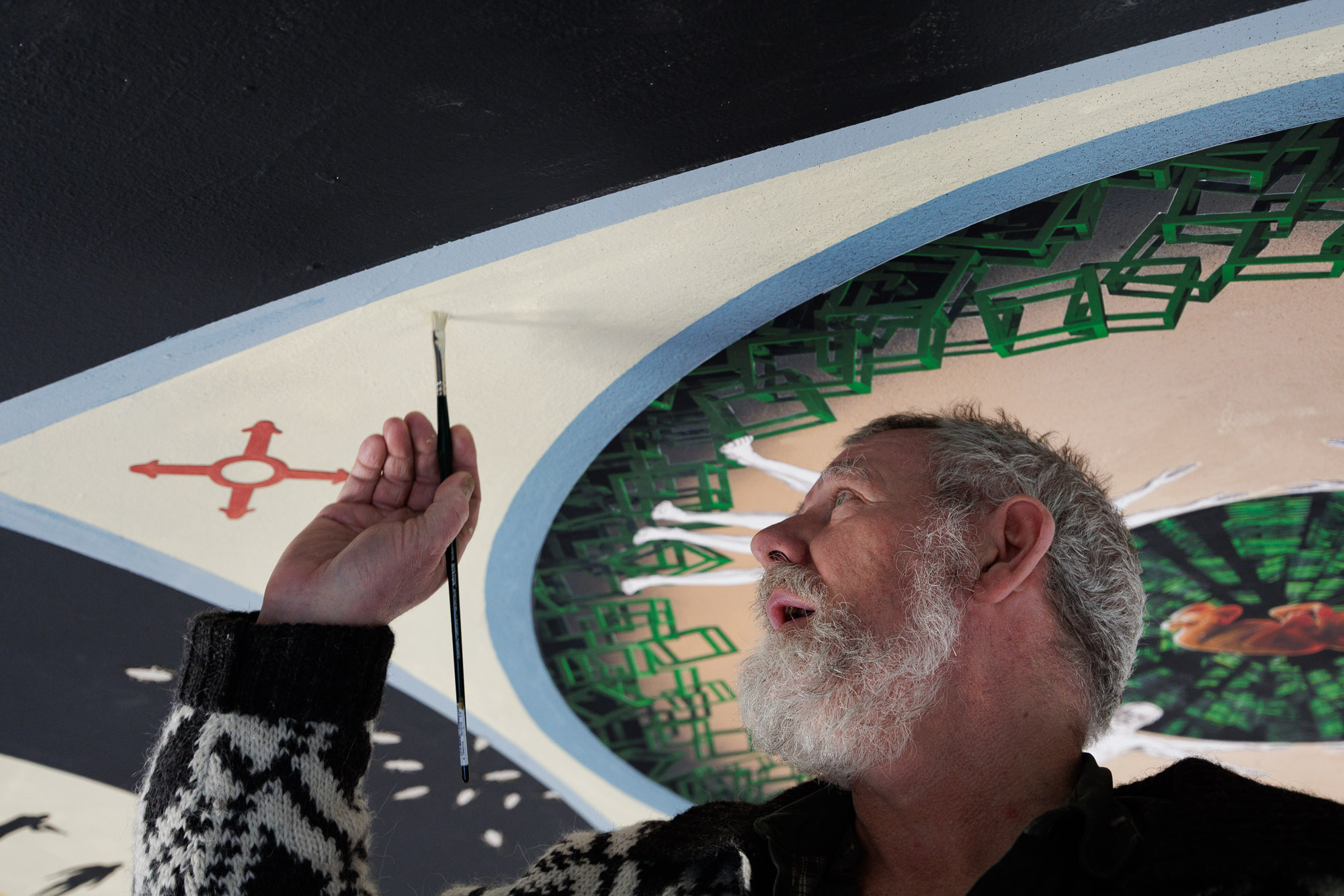 He gestures around at scraps of painting supplies, cookie wrappers, a pile of empty pilsner bottles, a wall where he makes a mark for every night he’s spent at the museum. “I love that. Maybe it sounds crazy, but, in a way, I think that’s more magnificent than this,” he says, pointing at the dome.