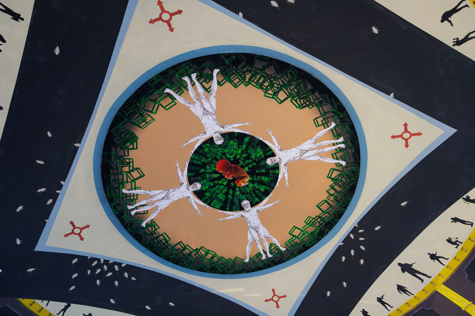 In the centre of the dome is a foetus, surrounded by four Vitruvian Man-like figures. “We all start like this,” Finnur says. “We have some DNA to work with, and then we have to decide what becomes of us. And we don’t decide it ourselves — not 100 percent. It’s the situation we live in, the family we are raised by, you know. It’s society.”