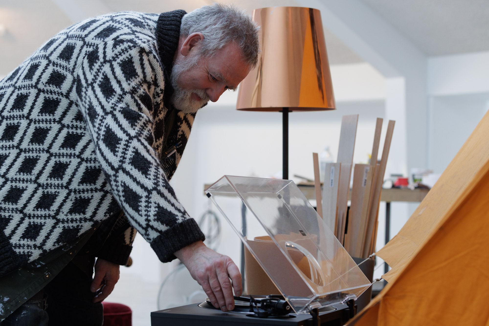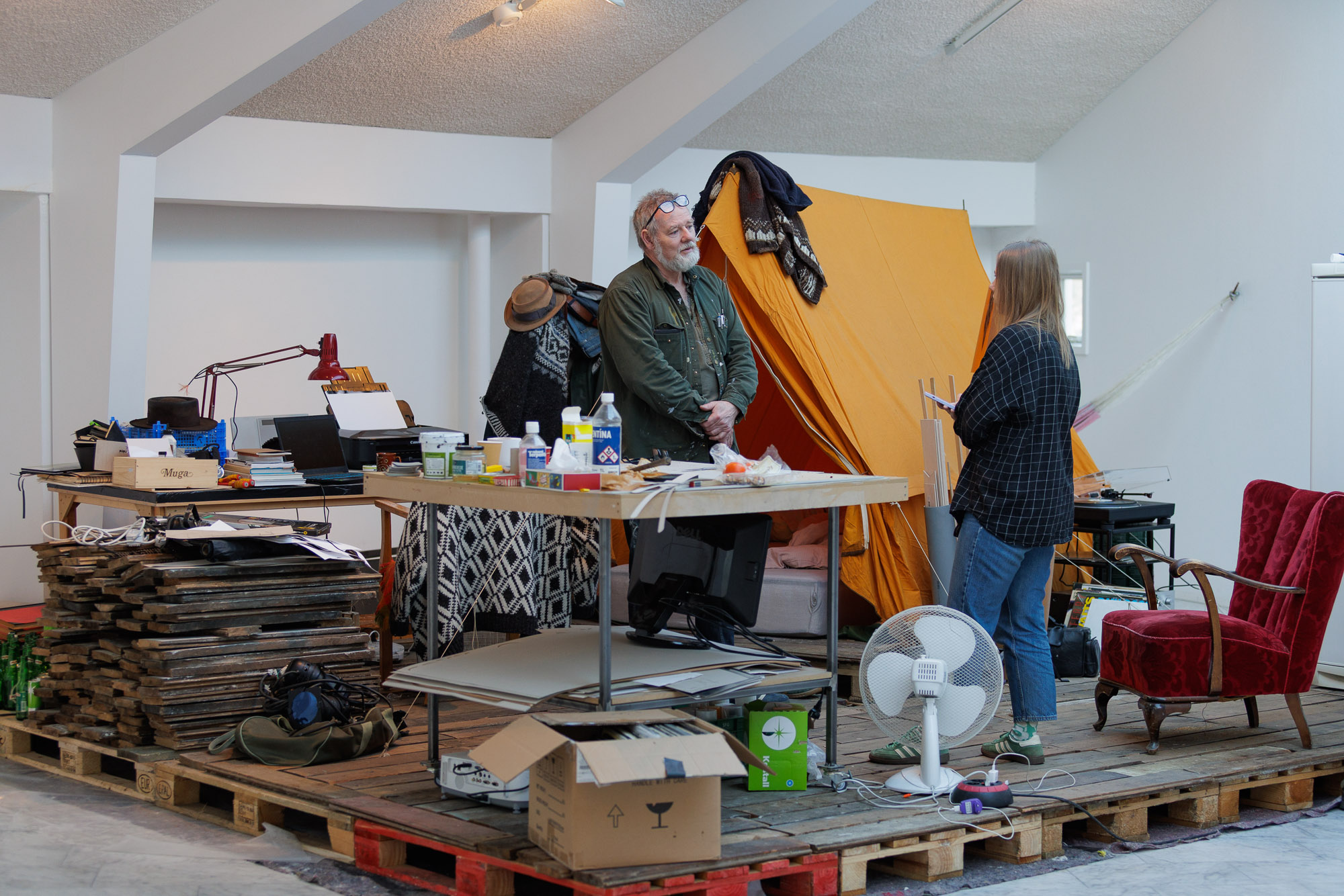 Thirty-eight nights ago, Finnur moved into an orange tent standing on a wooden platform in what would normally be Ásmundarsafn’s exhibition hall. He brought a desk, a full-size fridge — which he opens to show me is stocked with a stereotypical Icelandic combo of harðfiskur, skyr, a leftover bolla, and rows of (low alcohol) Egils Pilsner — a record player he got for his 60th birthday, a collection of hats, and even a hammock.
