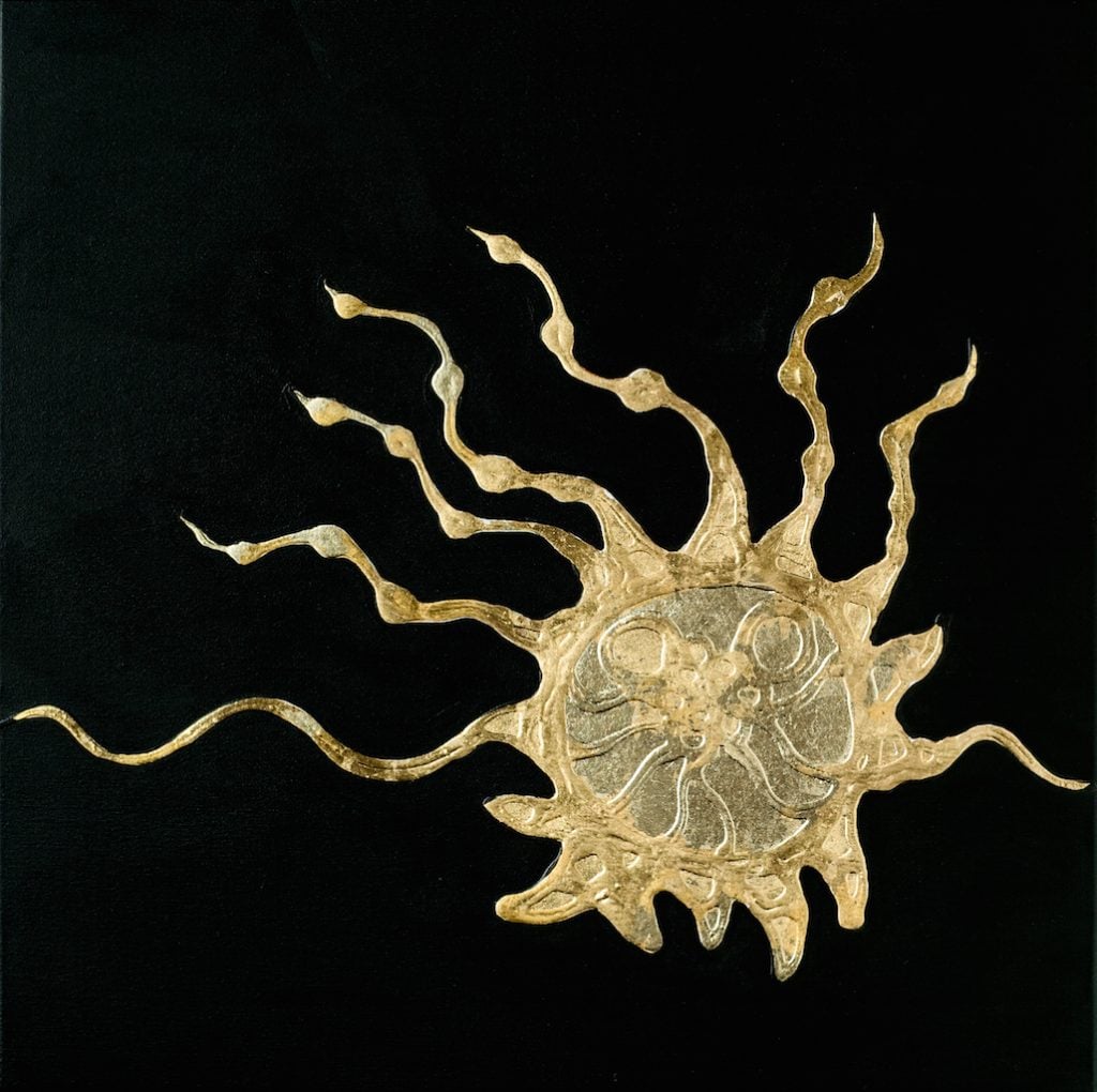 Some images become motifs, such as crescent moons, gold, hats, keys, hairy protrusions, and bright toadstools. One such repetition is the sun chariot—a golden vehicle that sails unaided through the sky of various works. “Most of the time I use black and white, and then the bright colours, like liquorice allsorts,” says Gabriela. “But the sun chariot had to be gold. I was shy to use gold at first, but then I started to use it more and more. In the end, I was really brave, and made this sun god, who’s counting all the gold.”