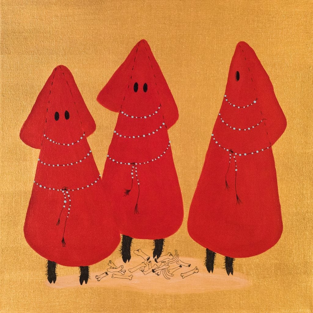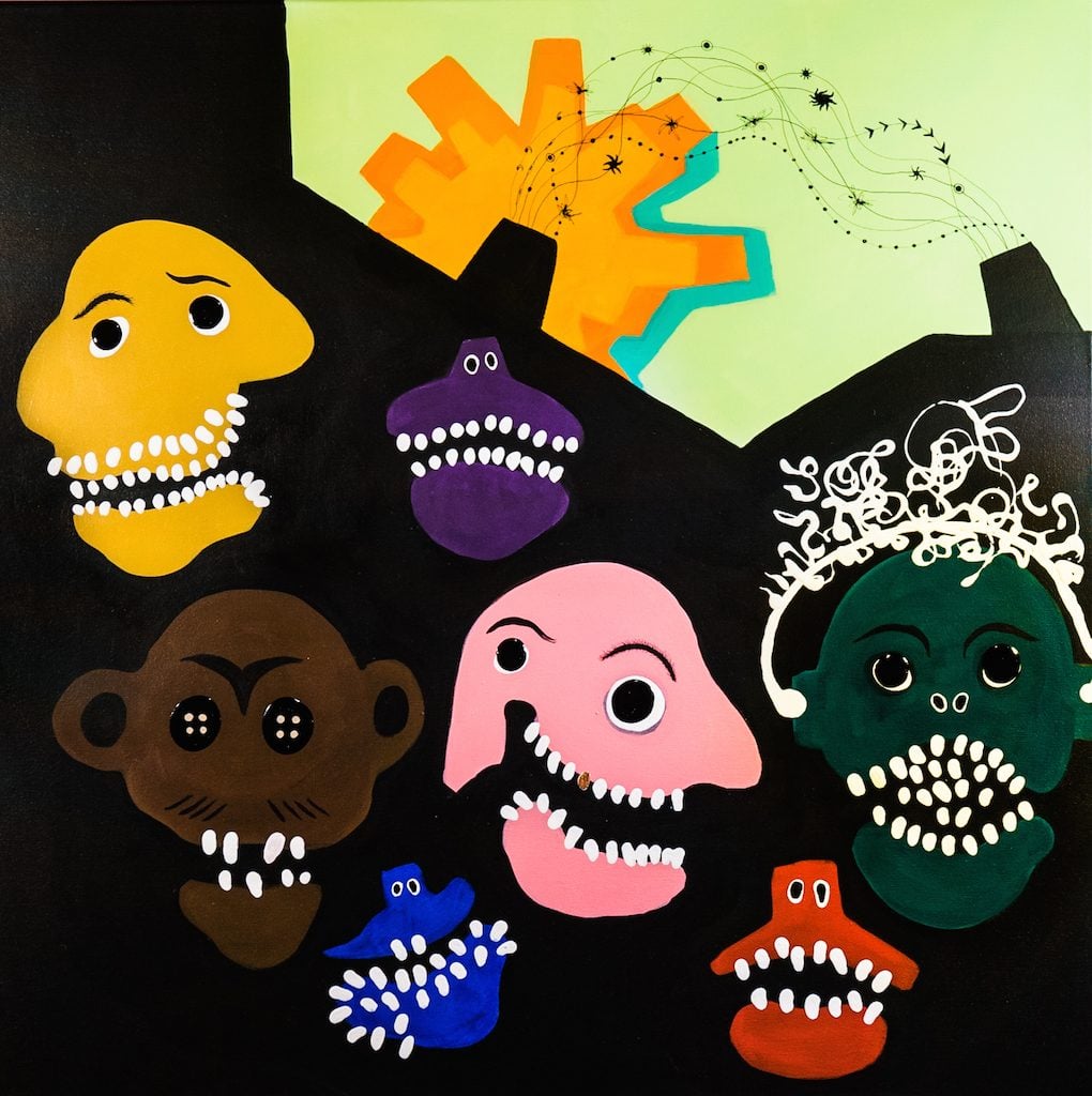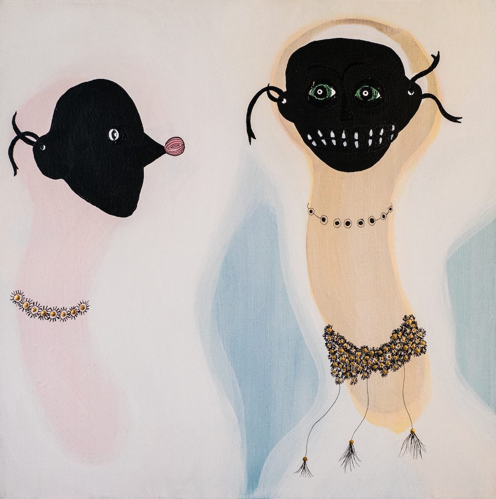 A menagerie of creatures stare out from the walls. Masked, red-caped clergymen sit alongside a key-bearing owl, a squadron of assorted toys, and a slumped jumping jack. Colourful chattering heads mingle with bizarre hairy animals, knobbly tree trunks with staring eyes, and odd beings inhabiting surreal melting landscapes. There are several scenes of mysterious congress; gatherings of creatures in bejewelled masks, often joined together by swirling, dotted patterns that could be seeds, cells, or planetary orbits. It’s like a peek through a doorway into a parallel dimension that’s at once familiar, inviting and completely alien.