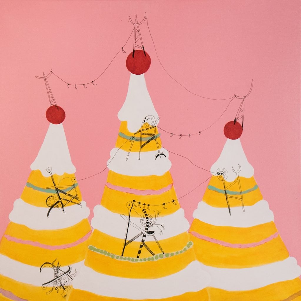 On the opposing wall is a painting of mountains depicted as towering melting cakes. “These are the Alps,” says Gabríela. “As you can see, the ice is melting, and the ski lifts are broken. This one is a little political too when it comes to the environment.”