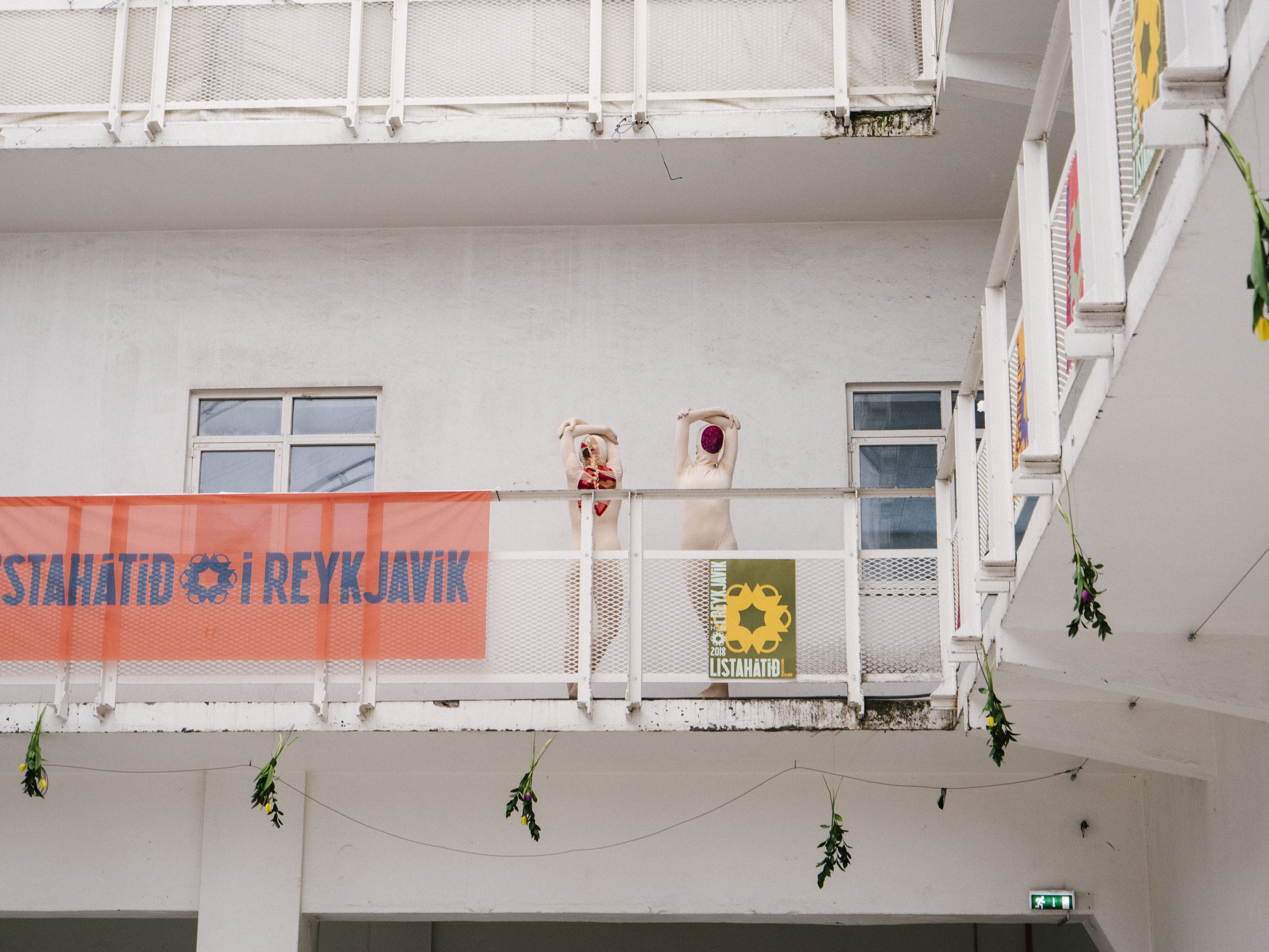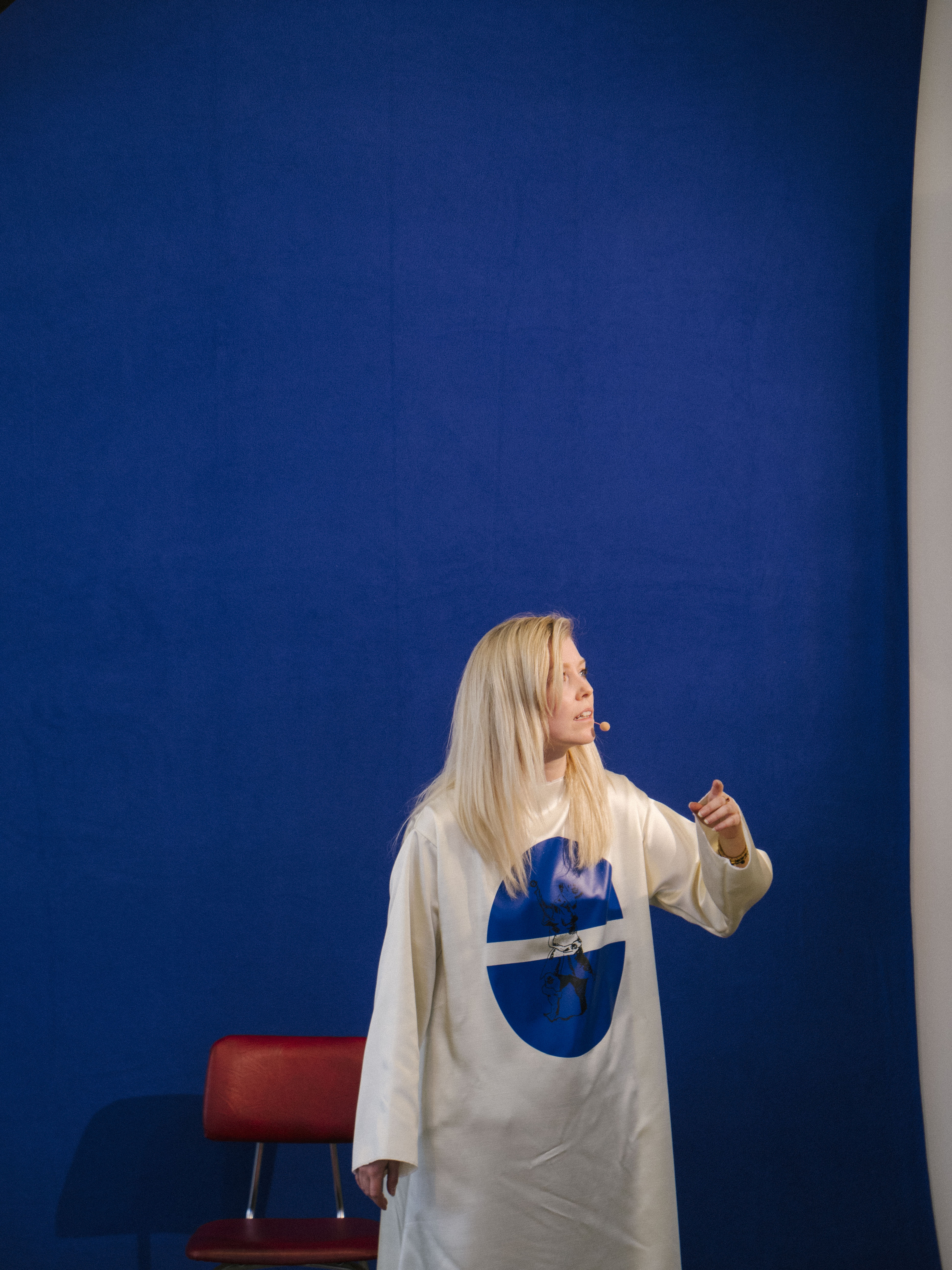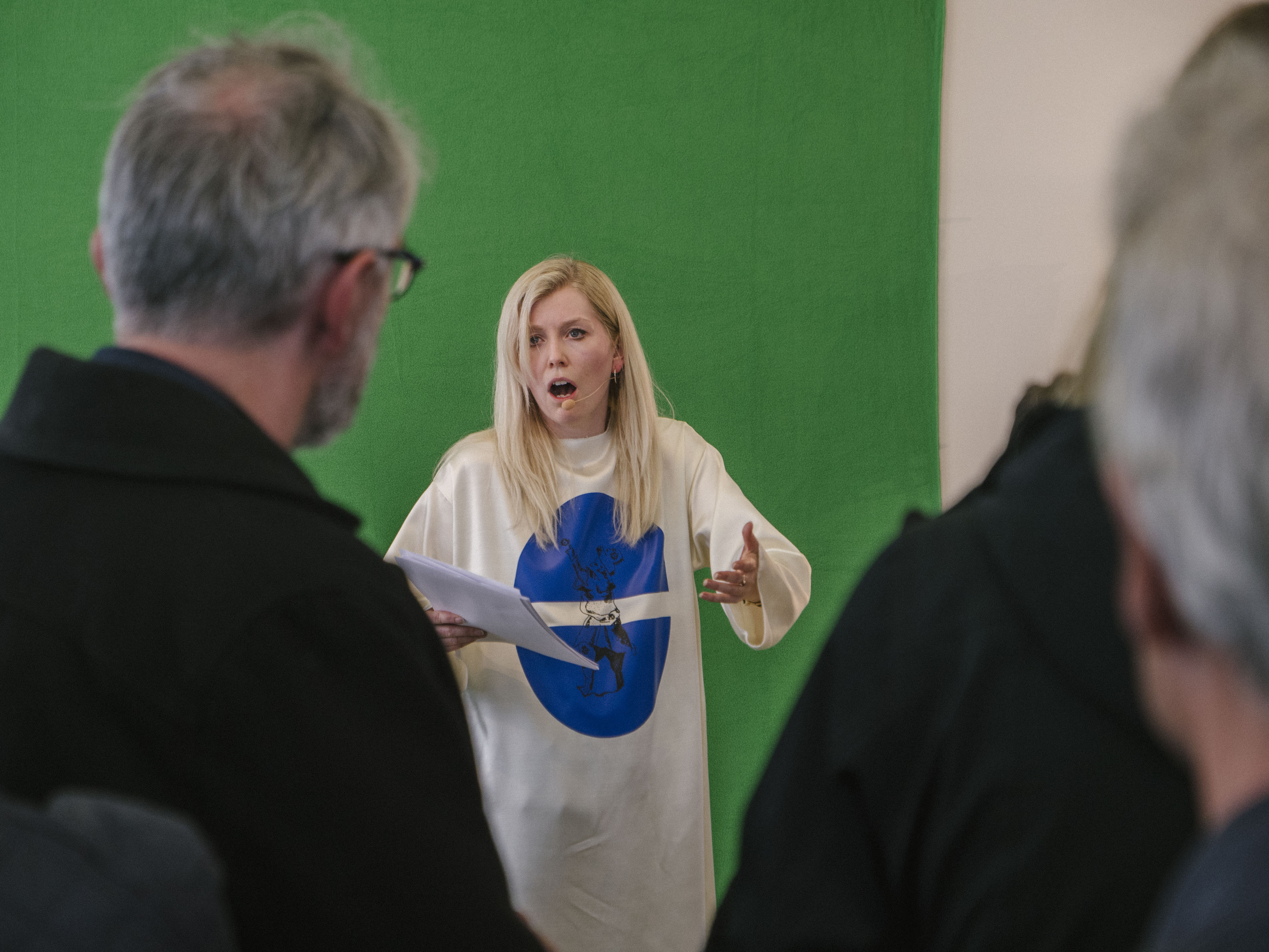 In Grandi, the Fisherman’s Day holiday is full swing, complete with the opening of the new Grandi Mathöll food hall. Up at the Kling & Bang gallery in The Marshall House, Ásta Fanney Sigurðardóttir’s performance—one of three that will make up a series called ‘Peppermint’—has already begun. Her ensemble cast wander around in a roped-off zone, dressed in matching white robes bearing round insignia. Ásta reads out from what seems to be a 70s sci-fi script, sometimes repeating her lines in different tones of voice, as if preparing for an audition: “The Morphoclogs are coming… to detect and destroy. Detect and destroy. Detect… and destroy.”