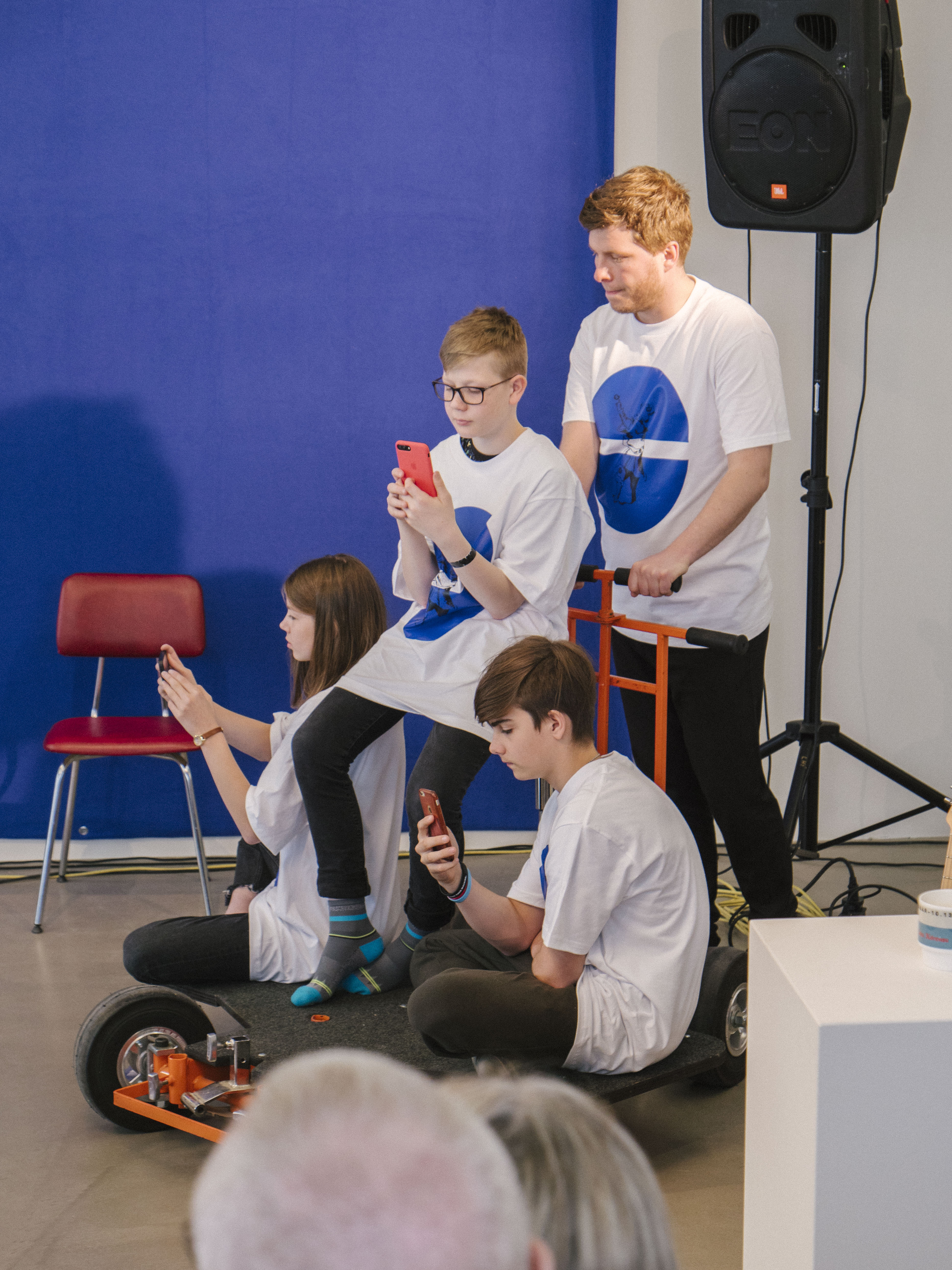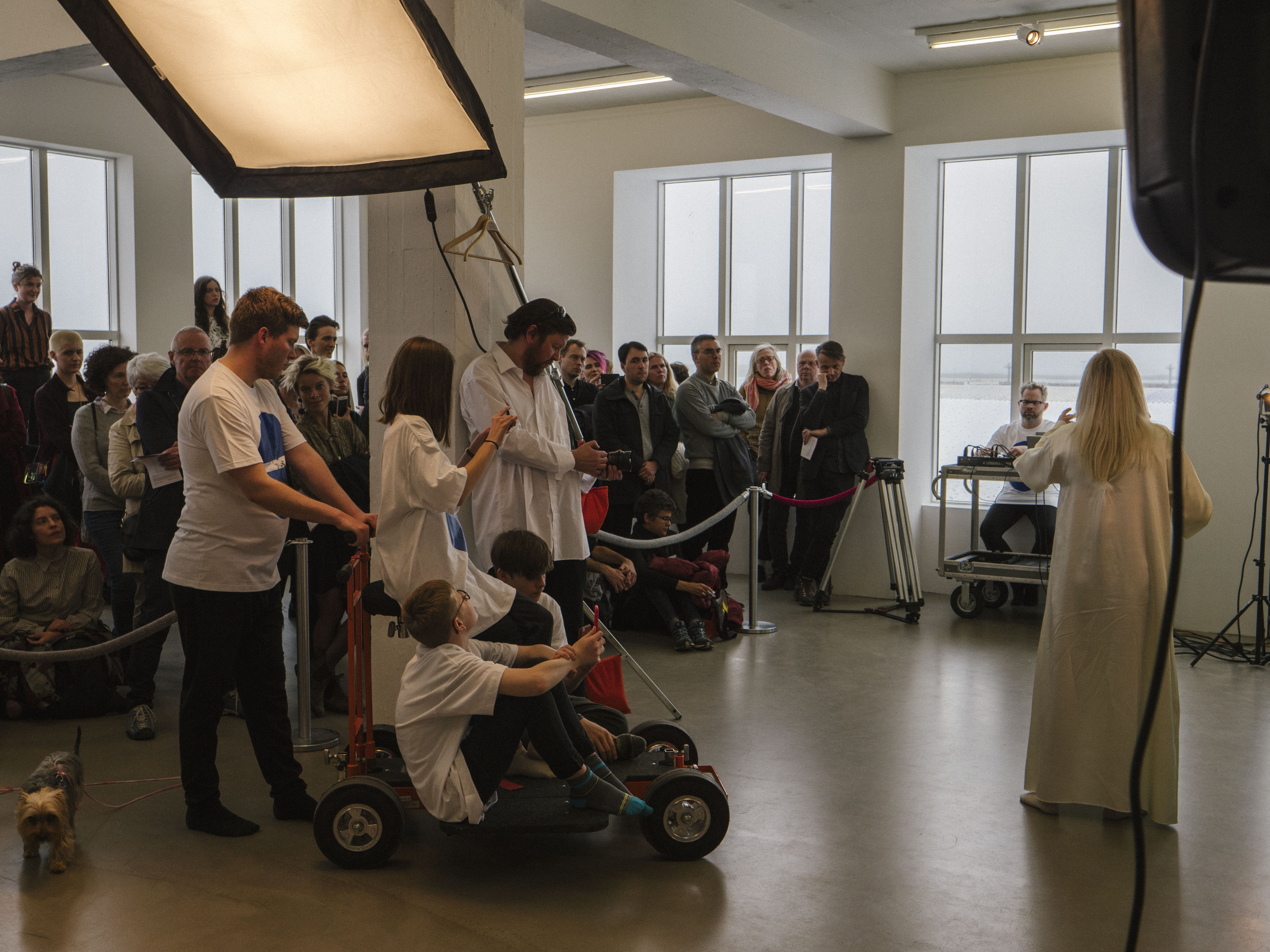 She meanders slowly around the space, her face impassive and her icy blue eyes searching the “white weather, white weather.” Curver Thoroddsen manipulates electronic rumbles and synth sounds from stage right; a trolley is pushed around with three children filming the proceedings on mobile phones, followed by a tiny, hapless dog. Ásta sometimes breaks into song, and guitar chords ring out around the gallery. The nonlinear script slowly reveals that the cast are trapped together in this foreboding scenario, where dangerous radiation is a factor, and survival is uncertain.