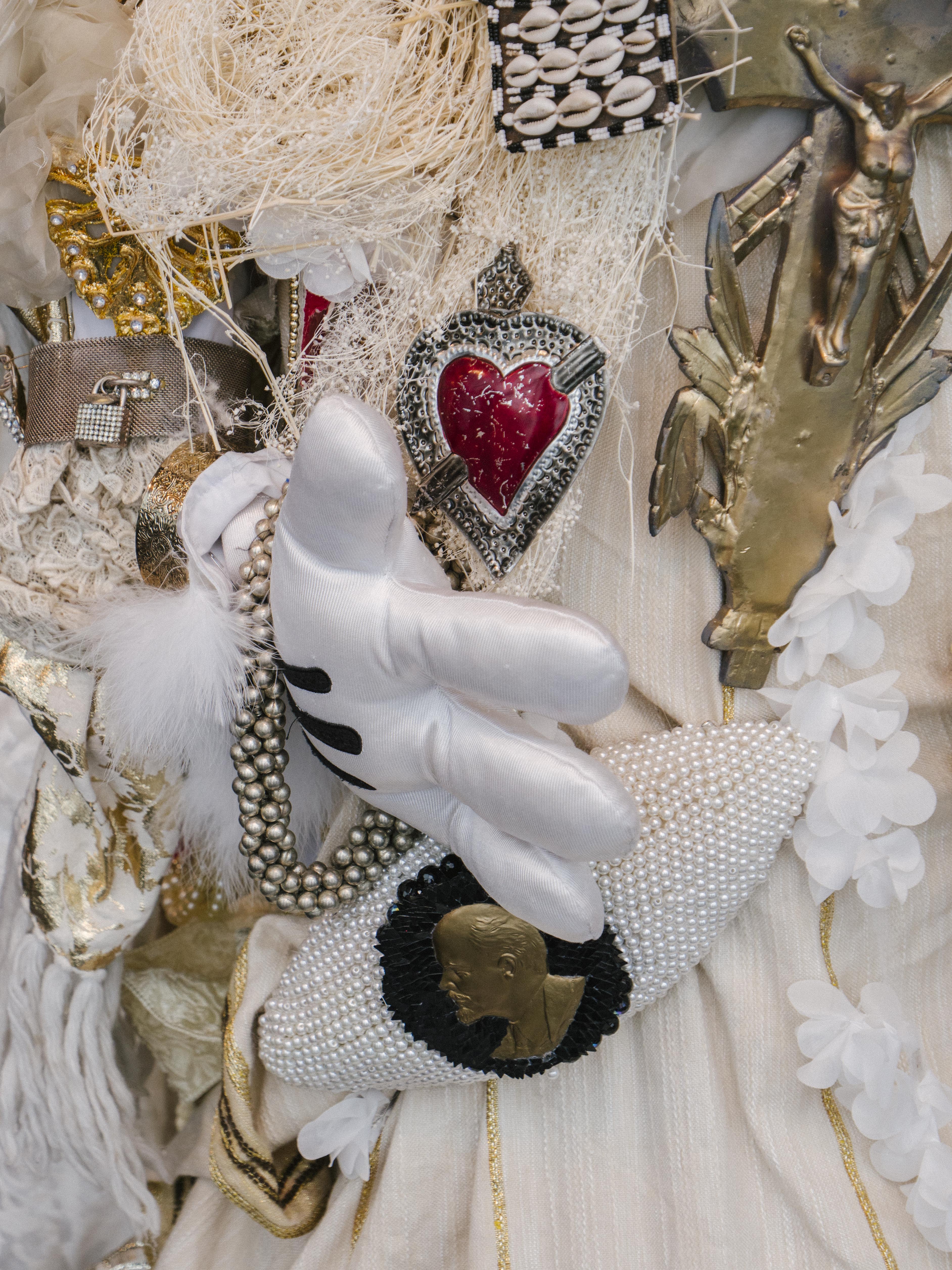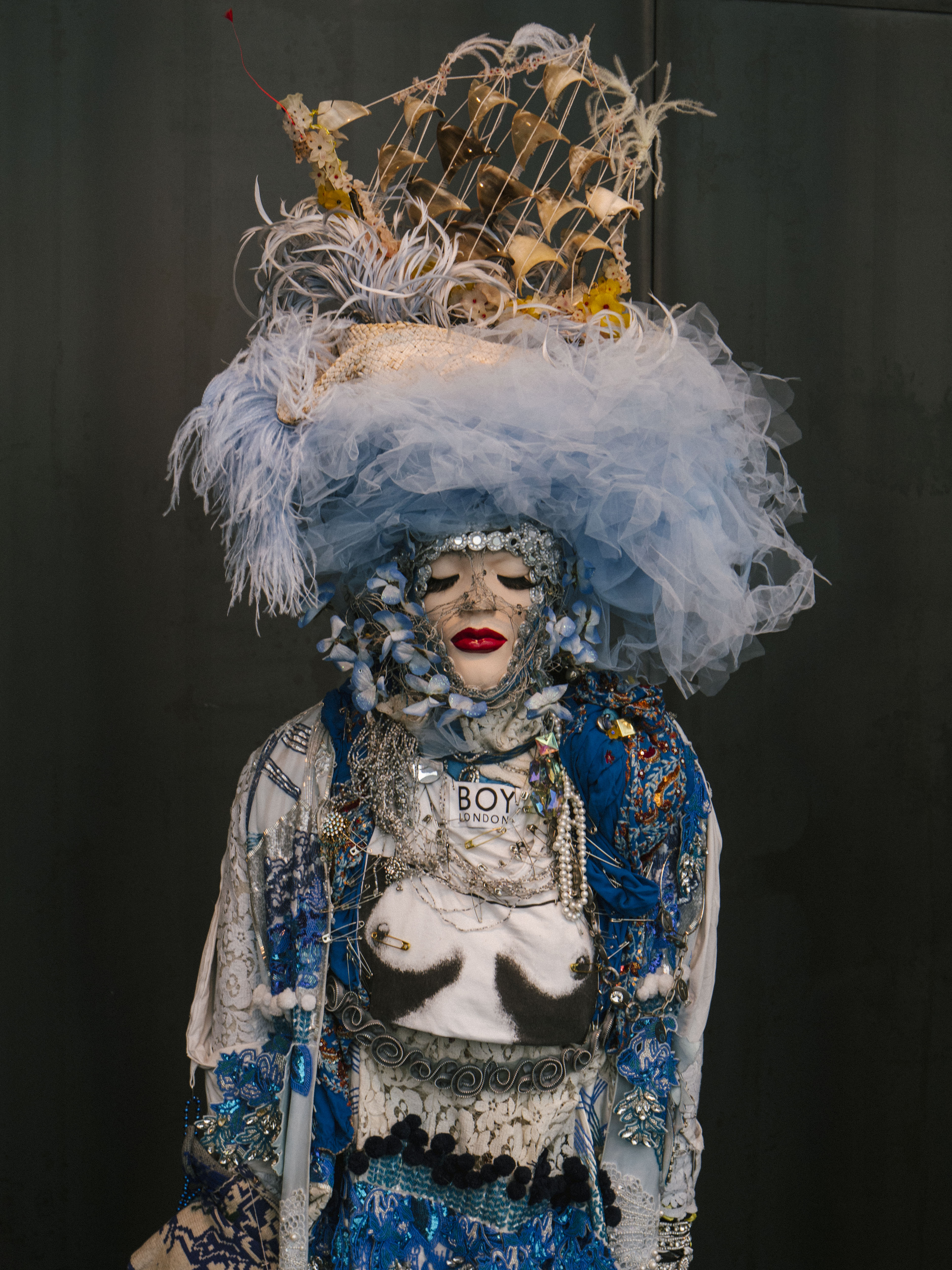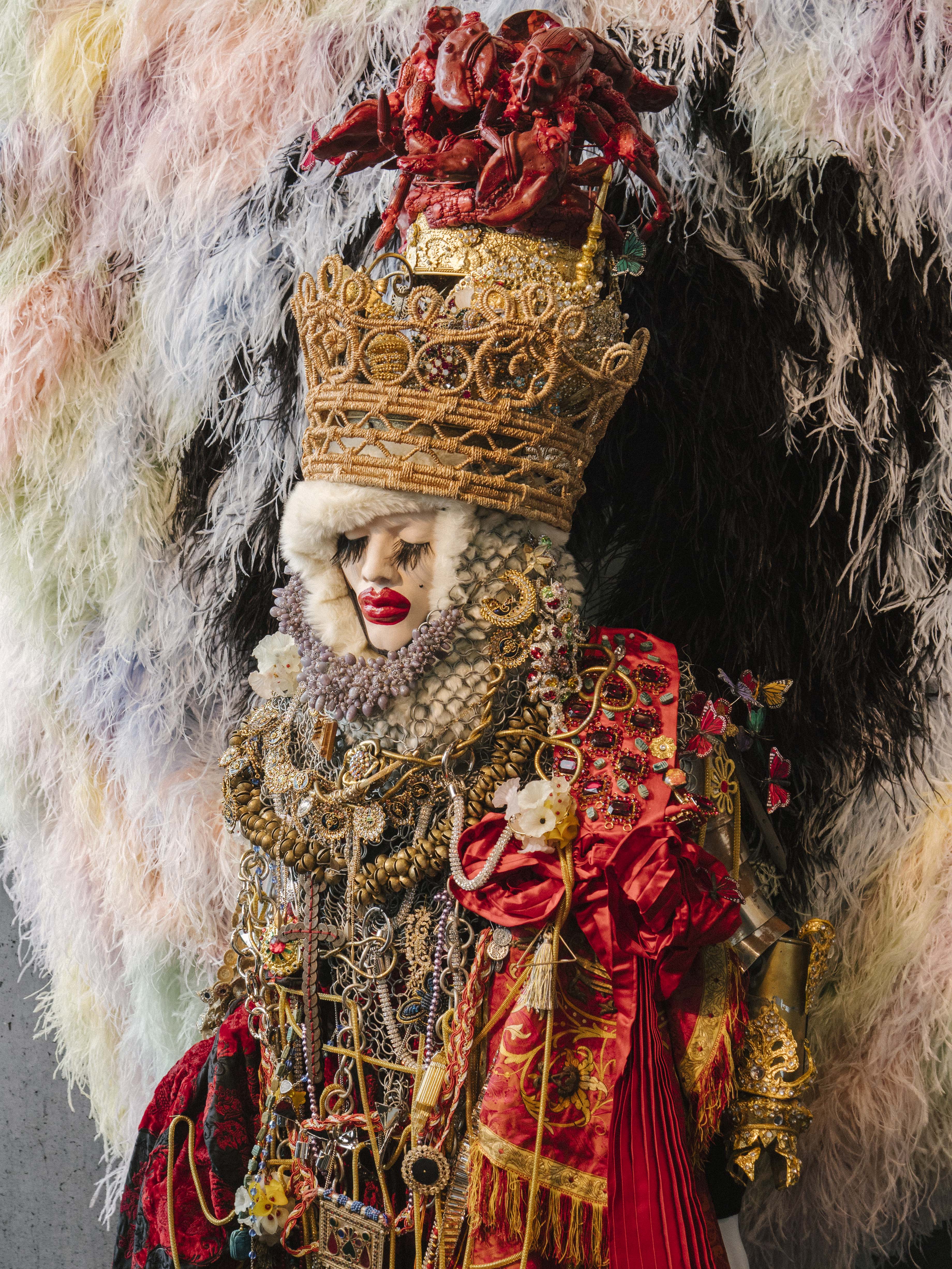 The show is partly sculptural and partly an autobiography-in-clothing, with the outfits constructed from pieces collected on the artist’s travels—or given to him by friends, family, celebrities and benefactors—mixed with Daniel’s own designs. Tangles of fabric, jewellery and assorted objects hang from each dizzyingly detailed piece. Some are loaded with pop art references, and others seem like poised monarchs, amplified club kids, or ornate deities. Daniel gives an emotional speech about the lows and highs of his career to date, and what it means to “live as art” and create his “army of me”; the audience applauds warmly, uniformly enthralled by his rich body of work.