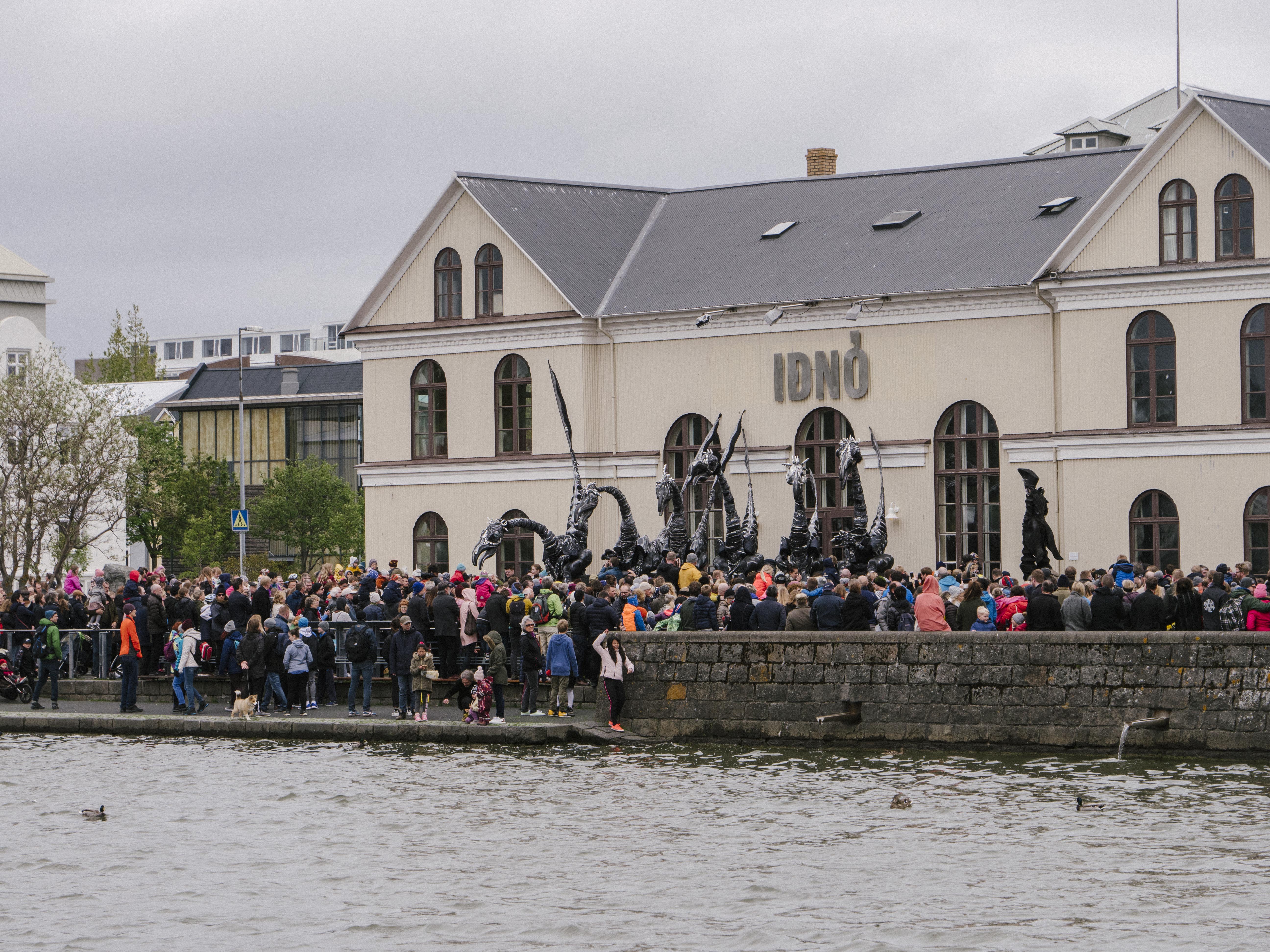 There’s something strange going on outside Iðnó. A cluster of tall, black, bipedal reptiles stand with their backs to the wall, looking out over Tjörnin. They peer down over the heads of the crowd that has gathered for the spectacle. Their jaws gnash, their tails lash, and their blue-green eyes glitter until a gothic ringmaster yells out an indecipherable series of commands—then they’re off, striding through the streets of Reykjavík, emitting weird howling sounds, pulling at the trees around them, bickering with each other, and snapping at the heads of passers by. Children howl in terror and delight, and the throng follows them down Lækjargata as they occasionally cohere into a defensive formation, or charge at the shrieking bystanders.