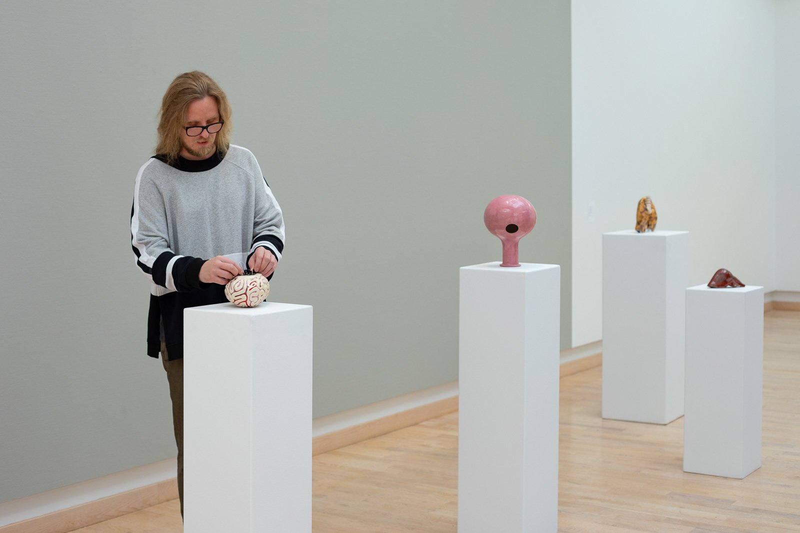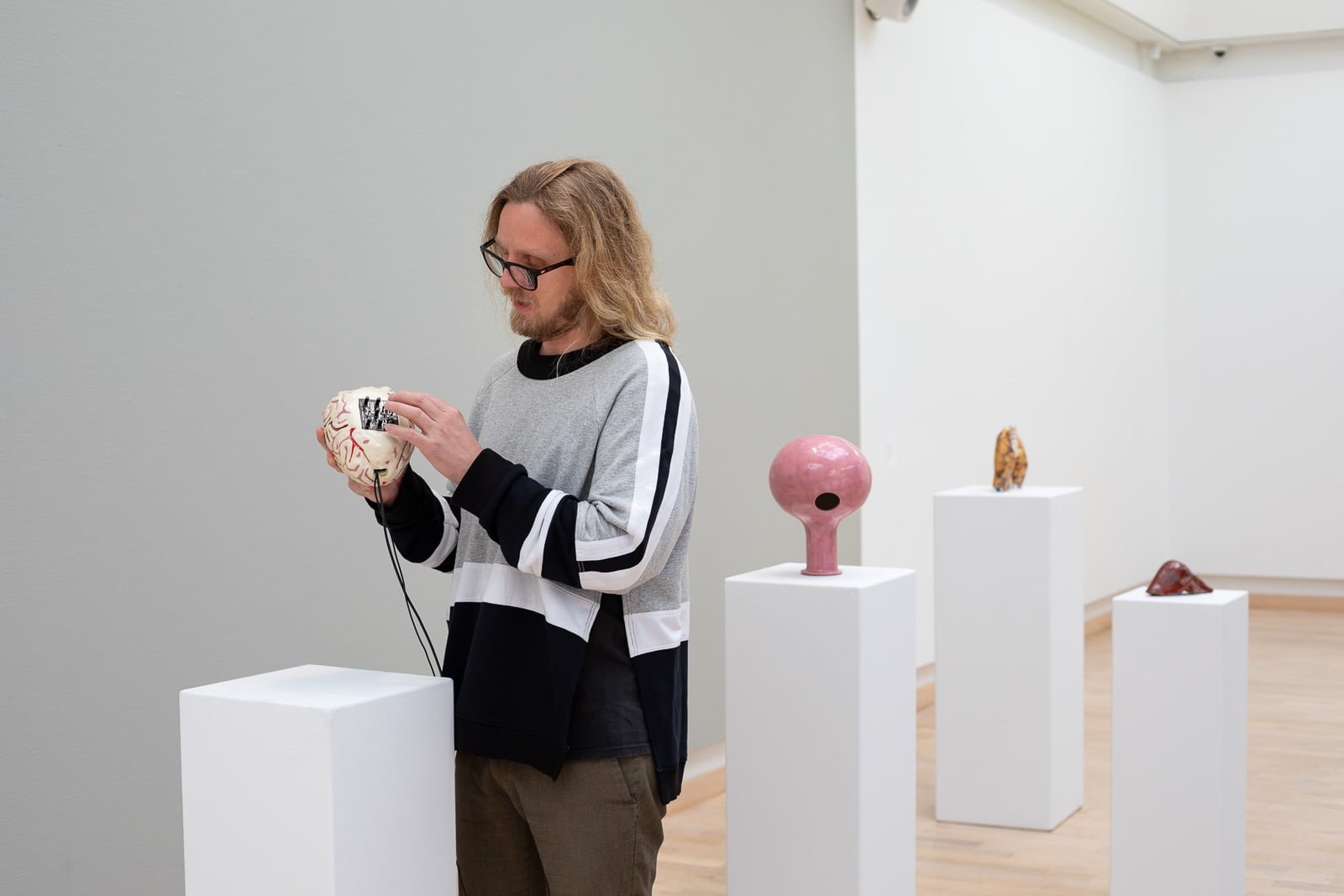 A free-spirited, whimsical soul, Styrmir Örn Guðmundsson is one of the exhibiting artists. Inspired by the name of the exhibition, Styrmir’s contribution explores sculpture as a medium by creating a hybrid of art and musical instruments. He has crafted a series of ceramic instruments that correspond to the vital organs of the human body.