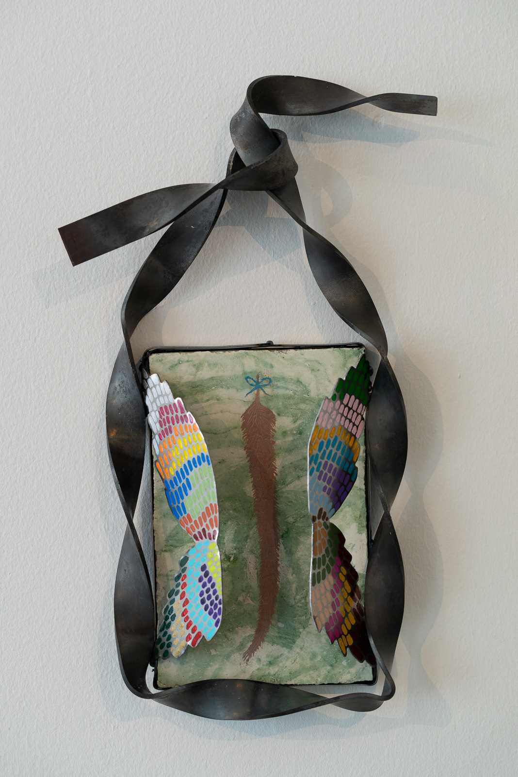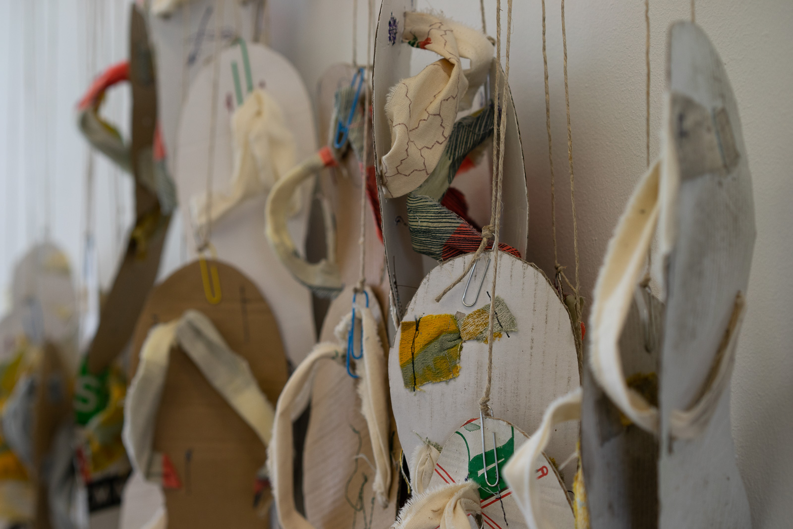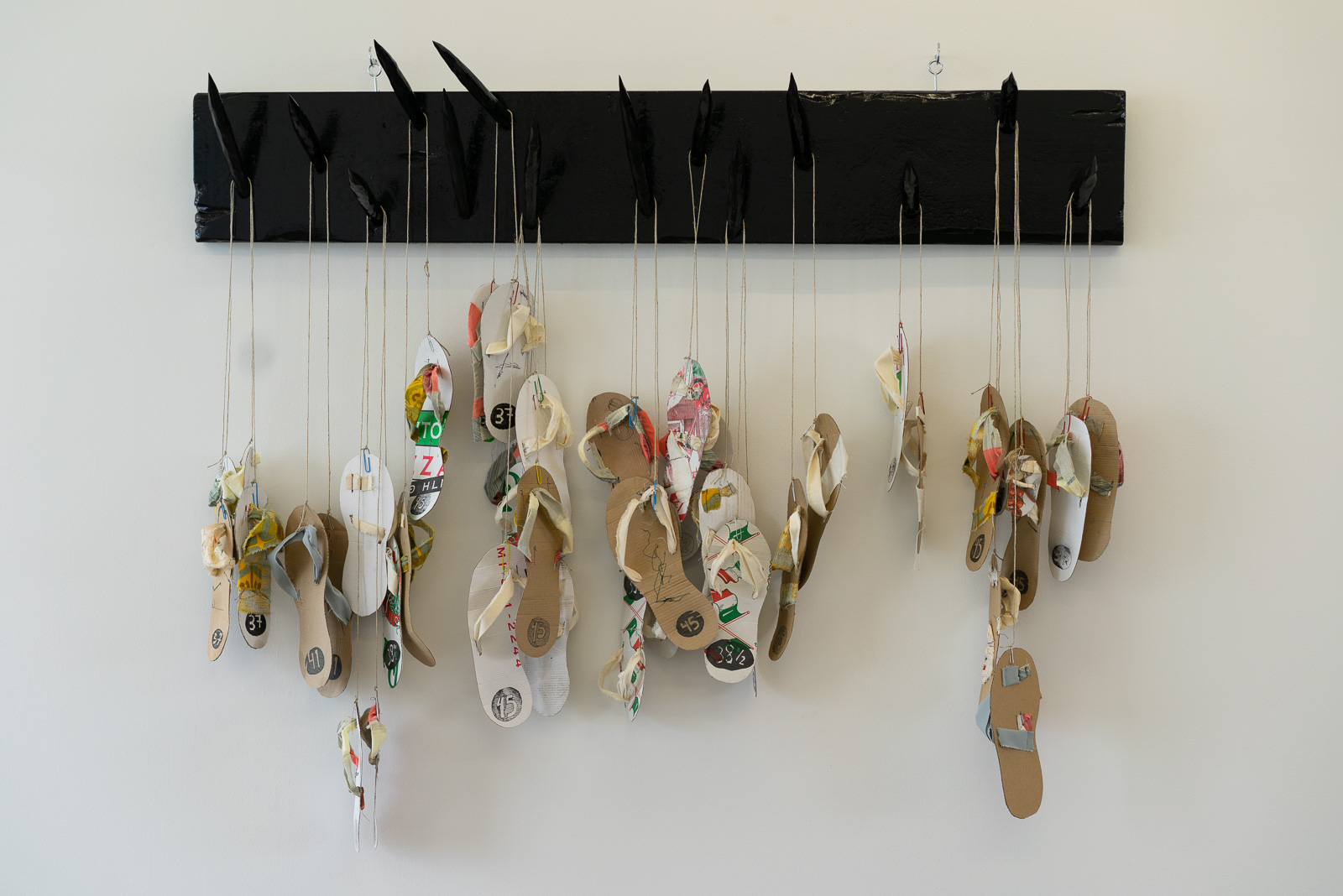 We’re first invited to try on pairs of delicate sandals made from used pizza boxes and hung on spikes reminiscent of a torture chamber. Indriði Arnar Ingólfsson’s poetic use of cheap, ready-made materials is reminiscent of conceptual artists like Rivane Neuenschwander and Art Provera.