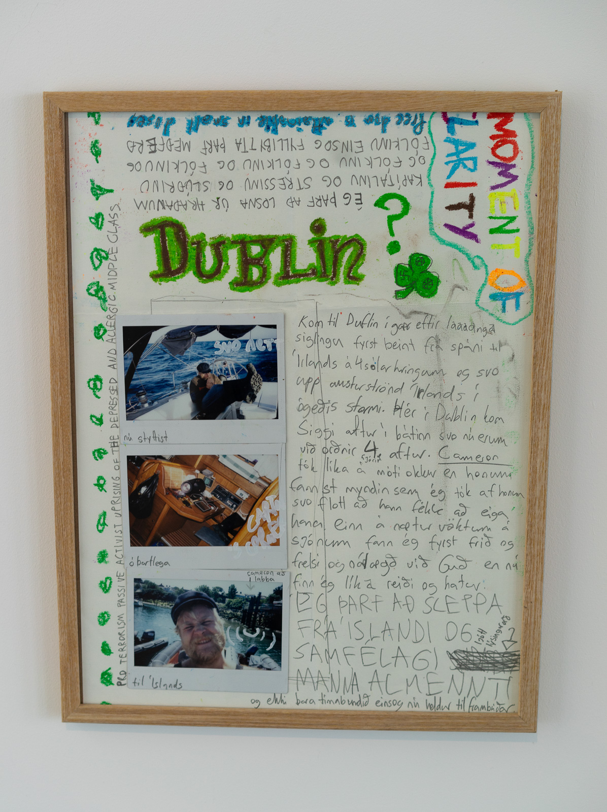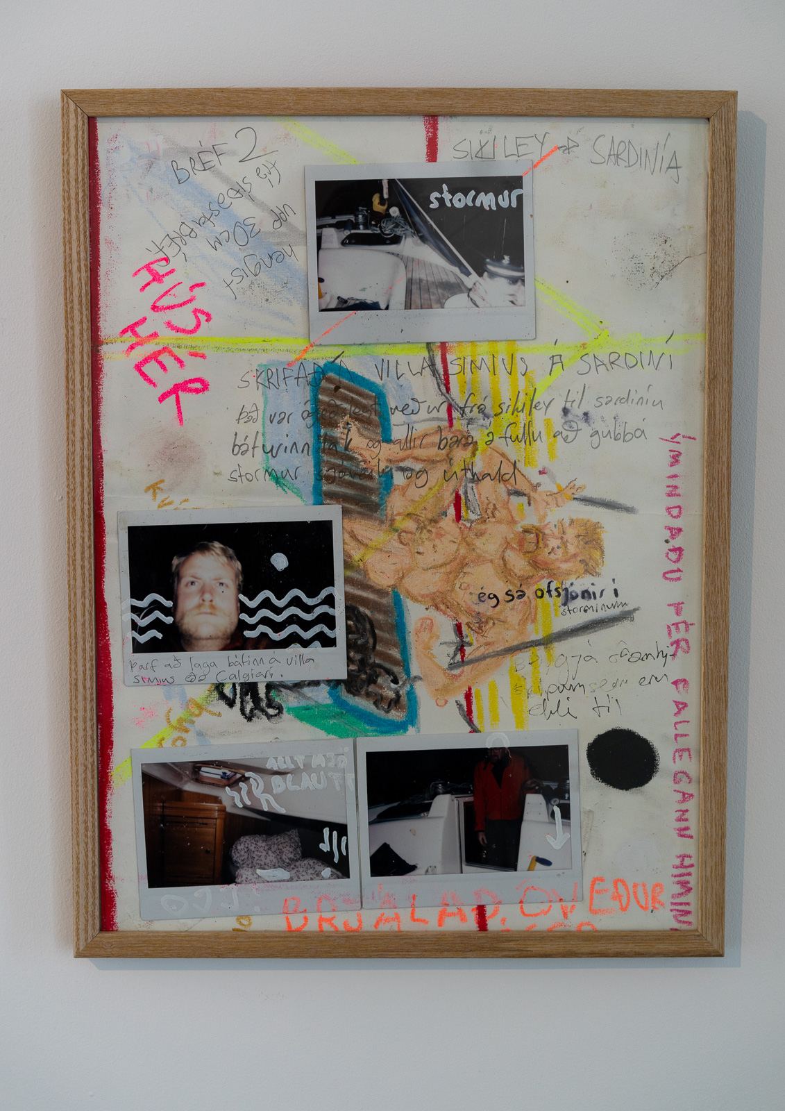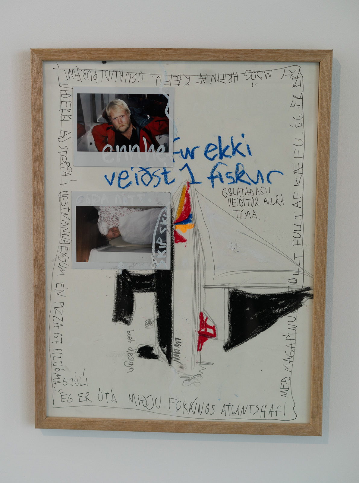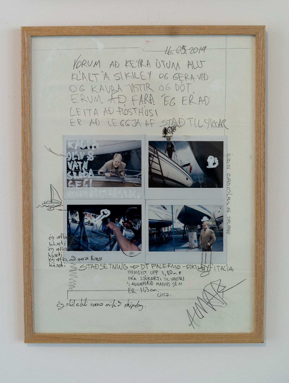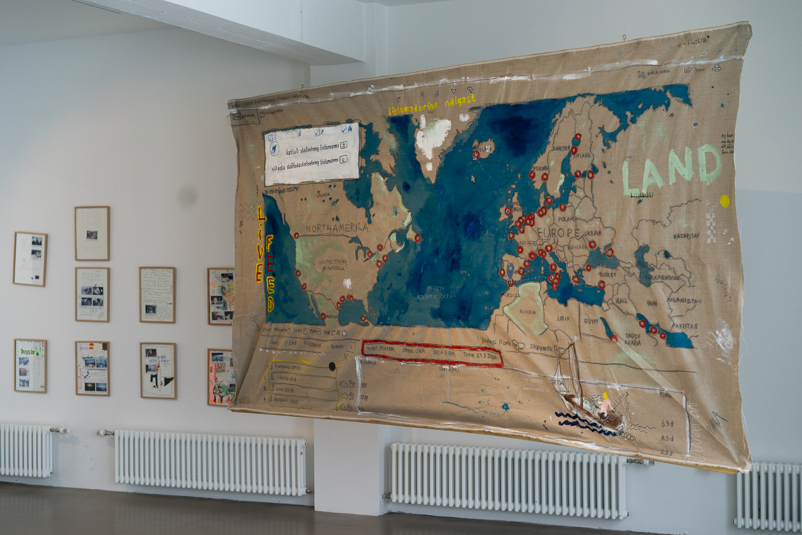Almar Steinn Atlason has been known as “Almar in the box” since he spent several days nude living in a glass box in a previous artwork. In “The Artist Approaches” he sails from Sicily to Reykjavík, and we see a map of his route and handwritten letters he mails along the way. There’s an undertone of art historical irony, referencing Jan Bas Adder’s ‘In Search of the Miraculous’—during which the artist was lost at sea and never found—and other travel and postcard documentation works from the ‘60s and ‘70s, mixed with real sentiments. It’s an impressive undertaking, but lacks original framing.