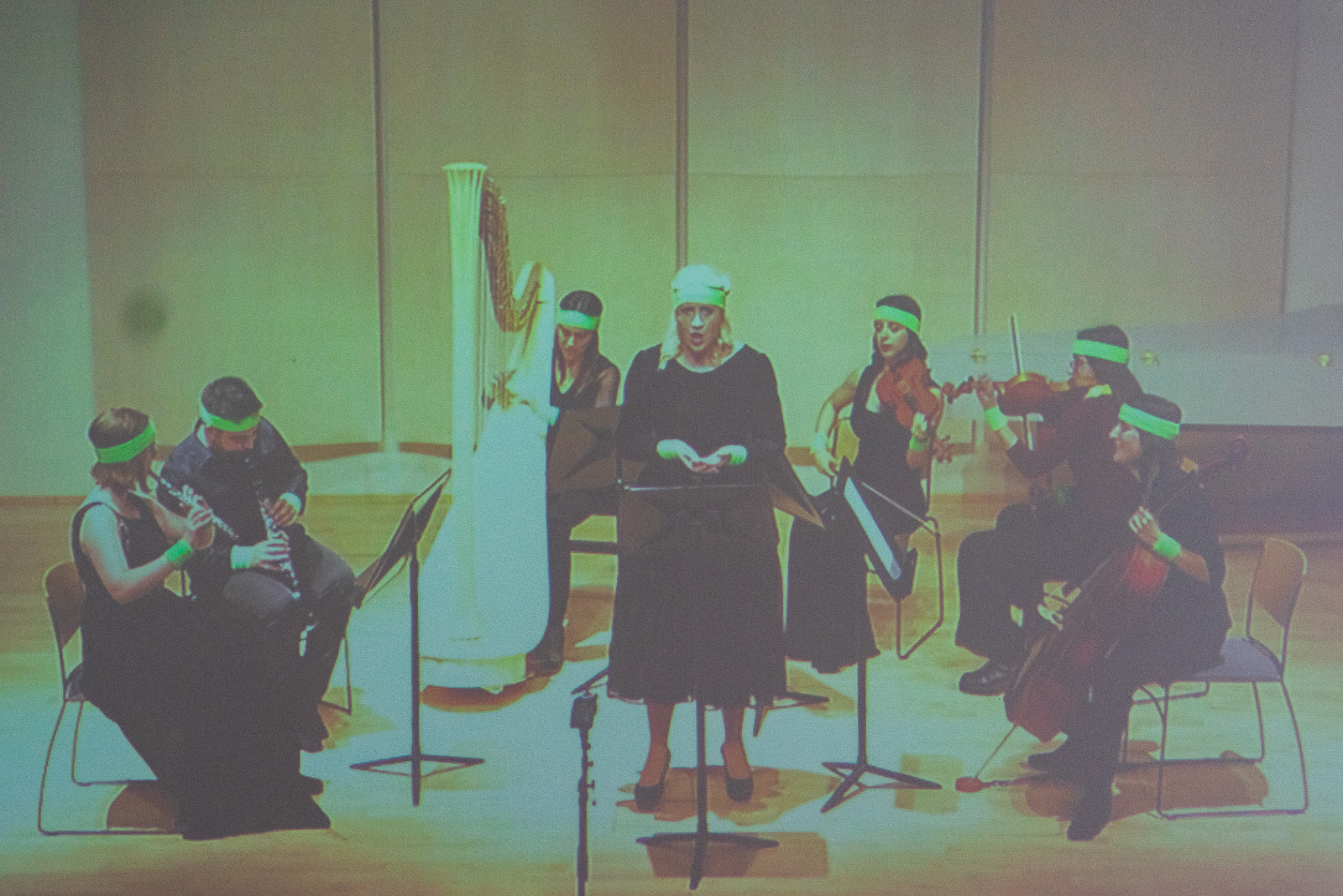 In the work we see a video of a life coach, dressed in sporting attire, urging the artist on. Next to it a projection runs, showing a musical ensemble and an opera singer wearing sweatbands. They perform the score we see on the wall, entitled “Tell Me a Bit More,” and cheer frantically for each other. Having a need for such stimulus is often looked down upon, but has an important role to play in enabling the artist to push on; here, it’s both sincere and humorous.