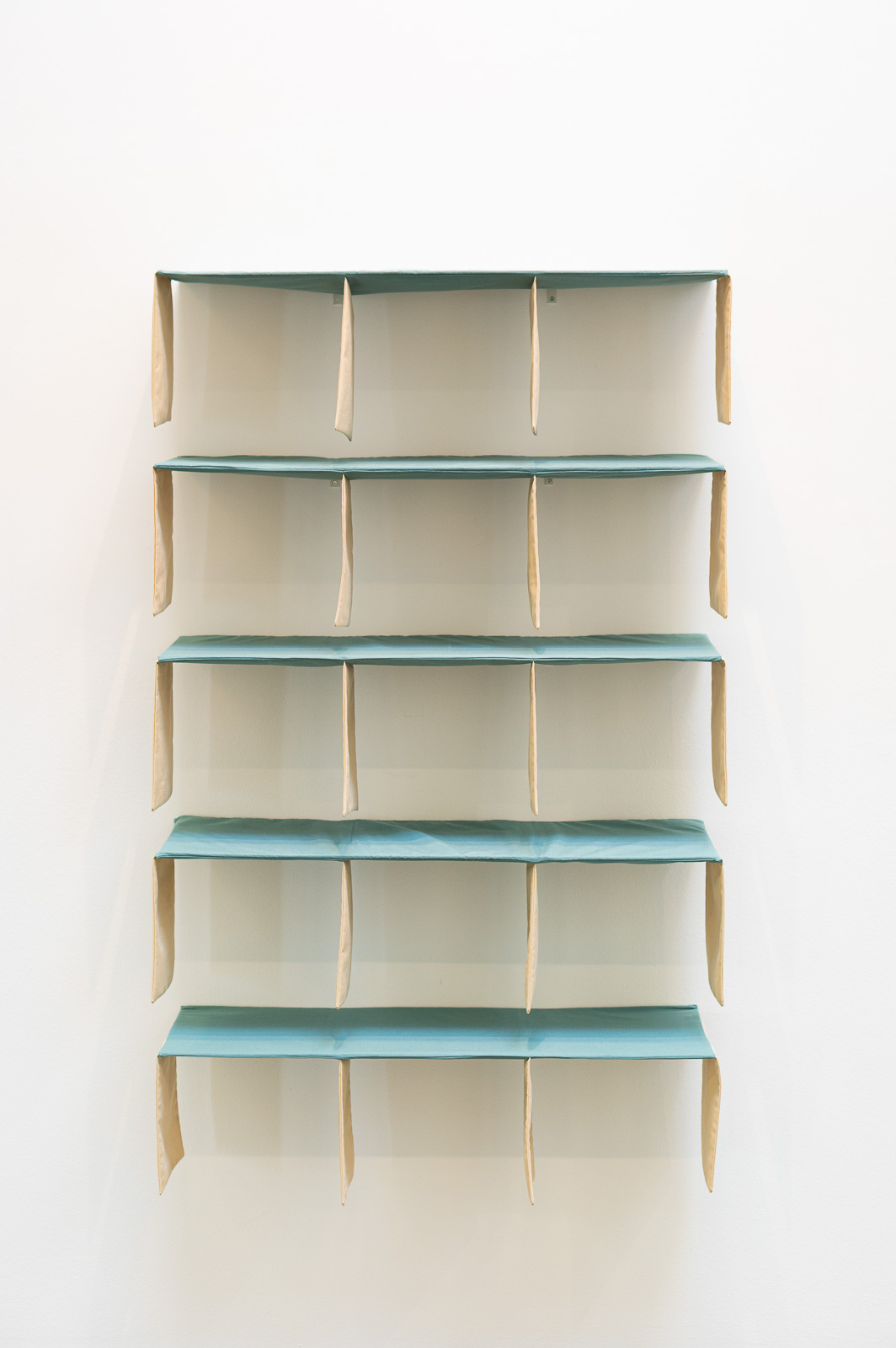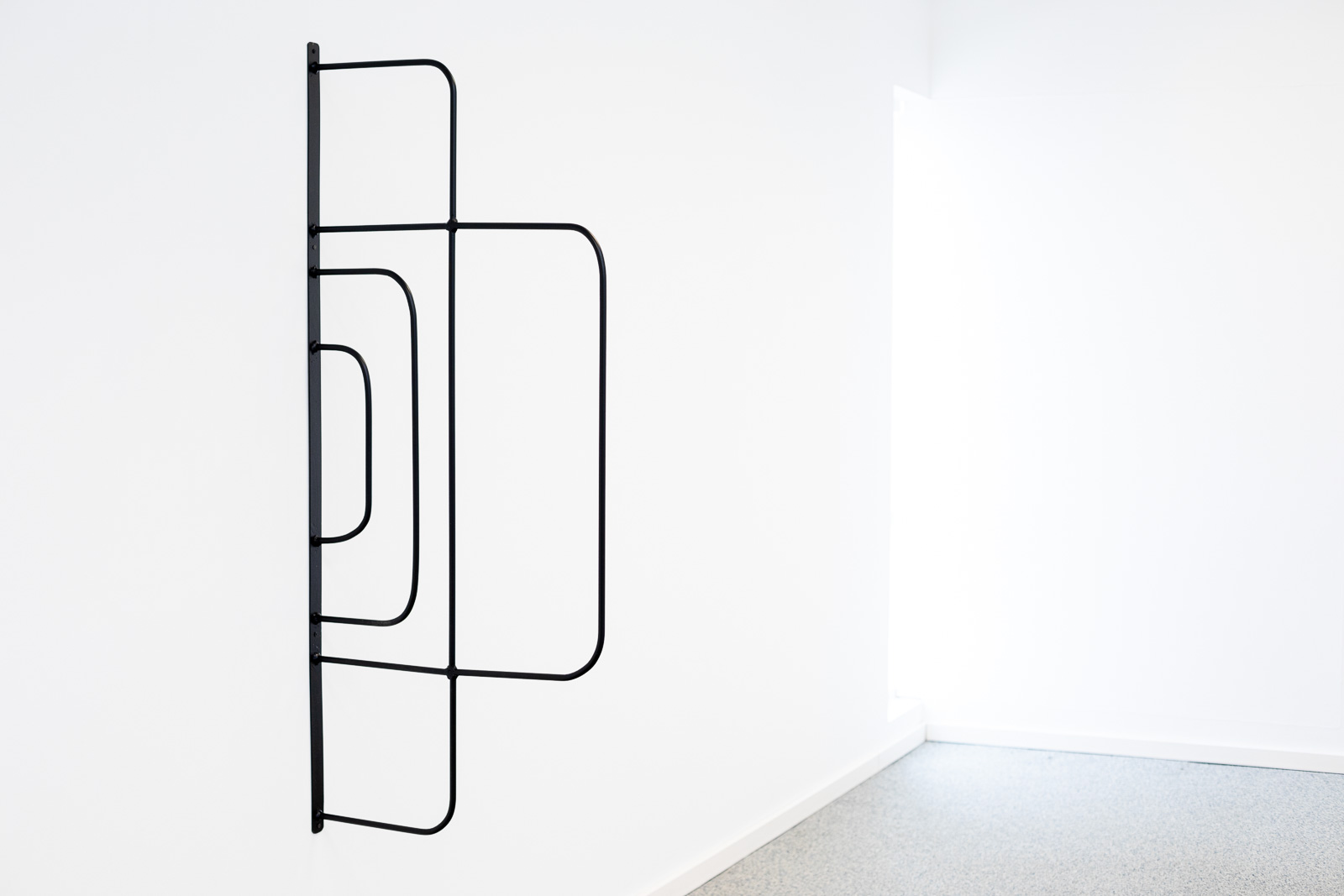 The neat stacks of the Mosfellsbær Library don’t stop abruptly at the door of the exhibition that lies hidden behind it; rather, they seem to continue on inside. The first piece, hung from crisp white walls, looks rather like a stack of shelves, or perhaps some sort of play shelf. After all, it’s made of fabric — hardly something the librarians can arrange their books on. Beyond this, a metal frame forms the shape of a chair. From a distance, it appears three dimensional, but a closer inspection shows it flattened against the wall, as unfit for function as the “shelves” that came before it. Together, these objects form the entrance to Guðlaug Mía Eyþórsdóttir’s new exhibition ‘Milli Hluta.’