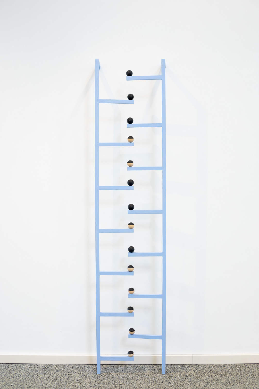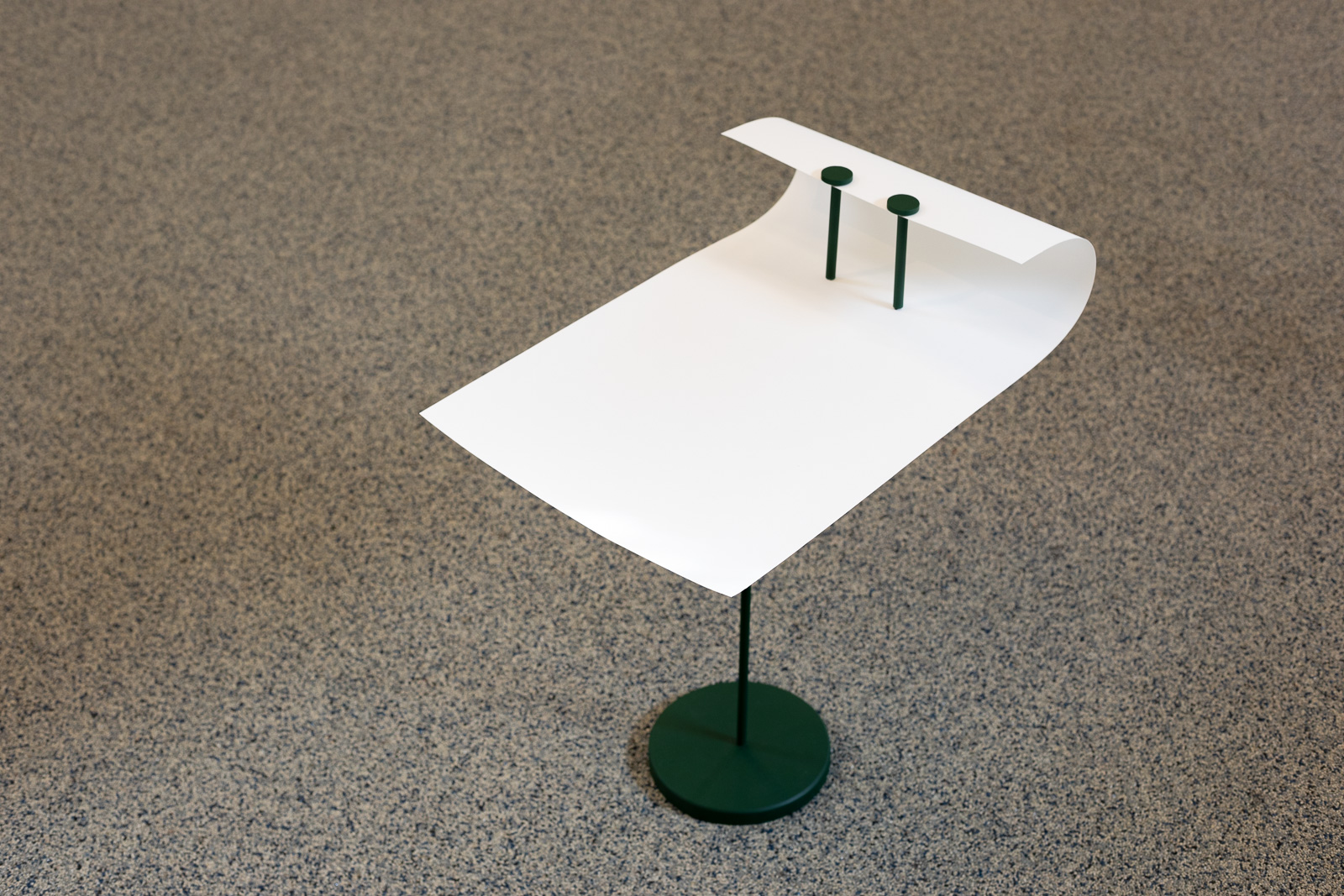 Like the title, the exhibition repeatedly teases the viewer with meaning and then with its absence. Each object is familiar yet unfamiliar: almost recognisable as an everyday object, but never quite. Is that a cabinet? Well, sort of, but certainly not one you could keep anything in. Moreover, there are no titles or placards to help the viewer out. Instead, each piece stands anonymously, spaced evenly around the white room, silently begging questions but answering none.