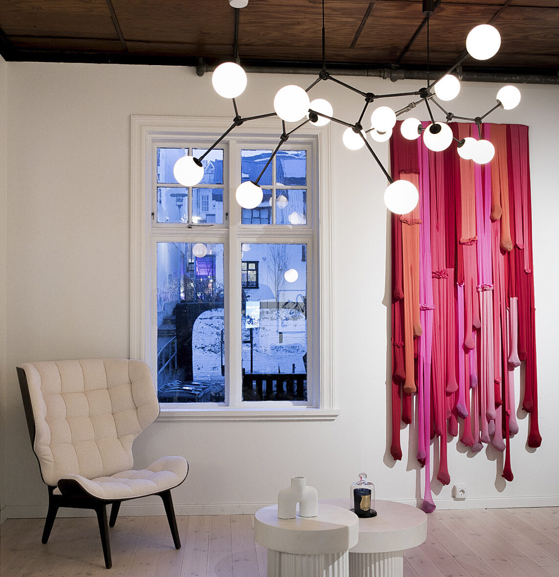 Nylon tights are the primary medium and means of production in this exhibit by The Icelandic Love Corporation. The exhibition takes its title—which means “resilient”—from a particular piece which comprises stones placed in the feet of the aforementioned hosiery. Tights are also used to create interesting oil paint prints. JP
