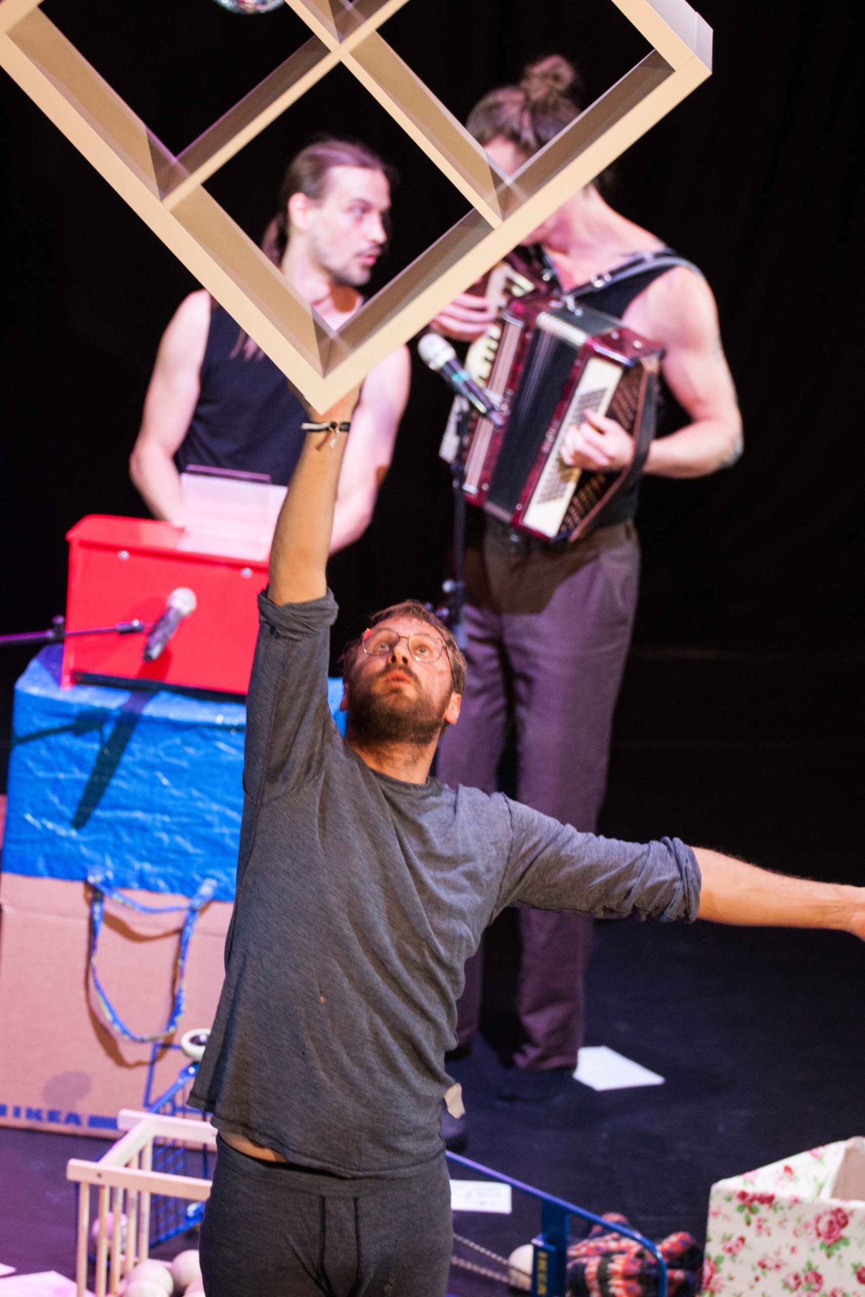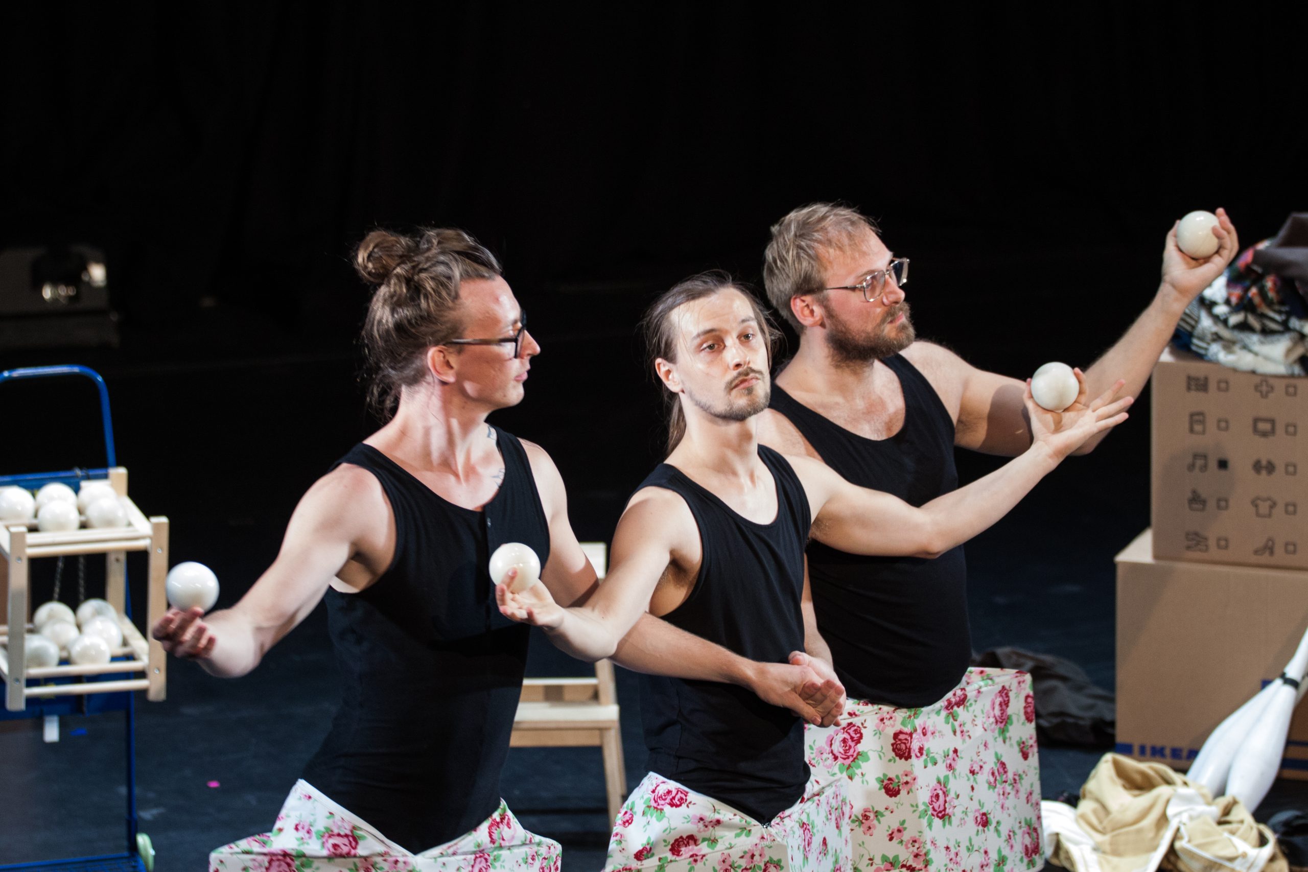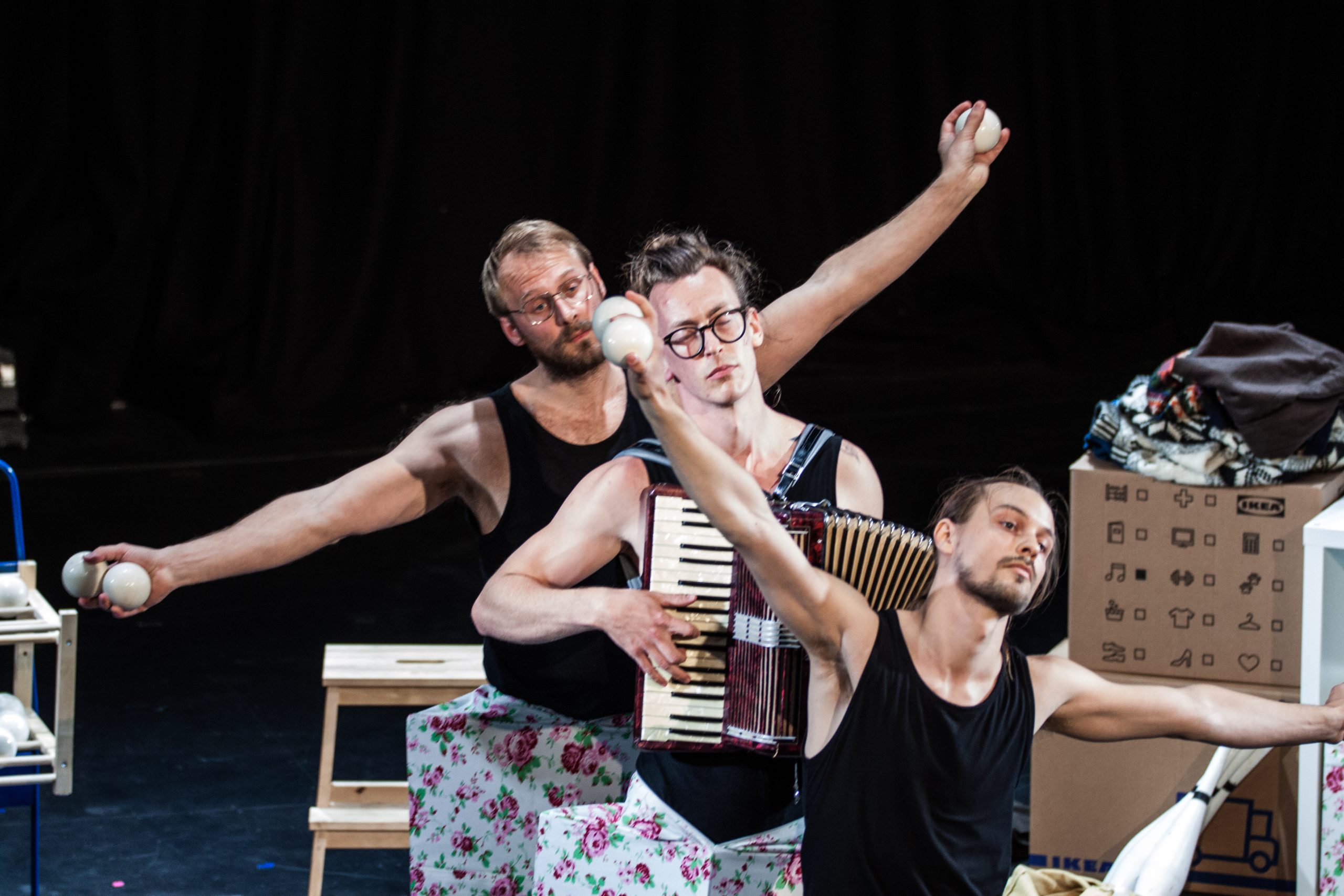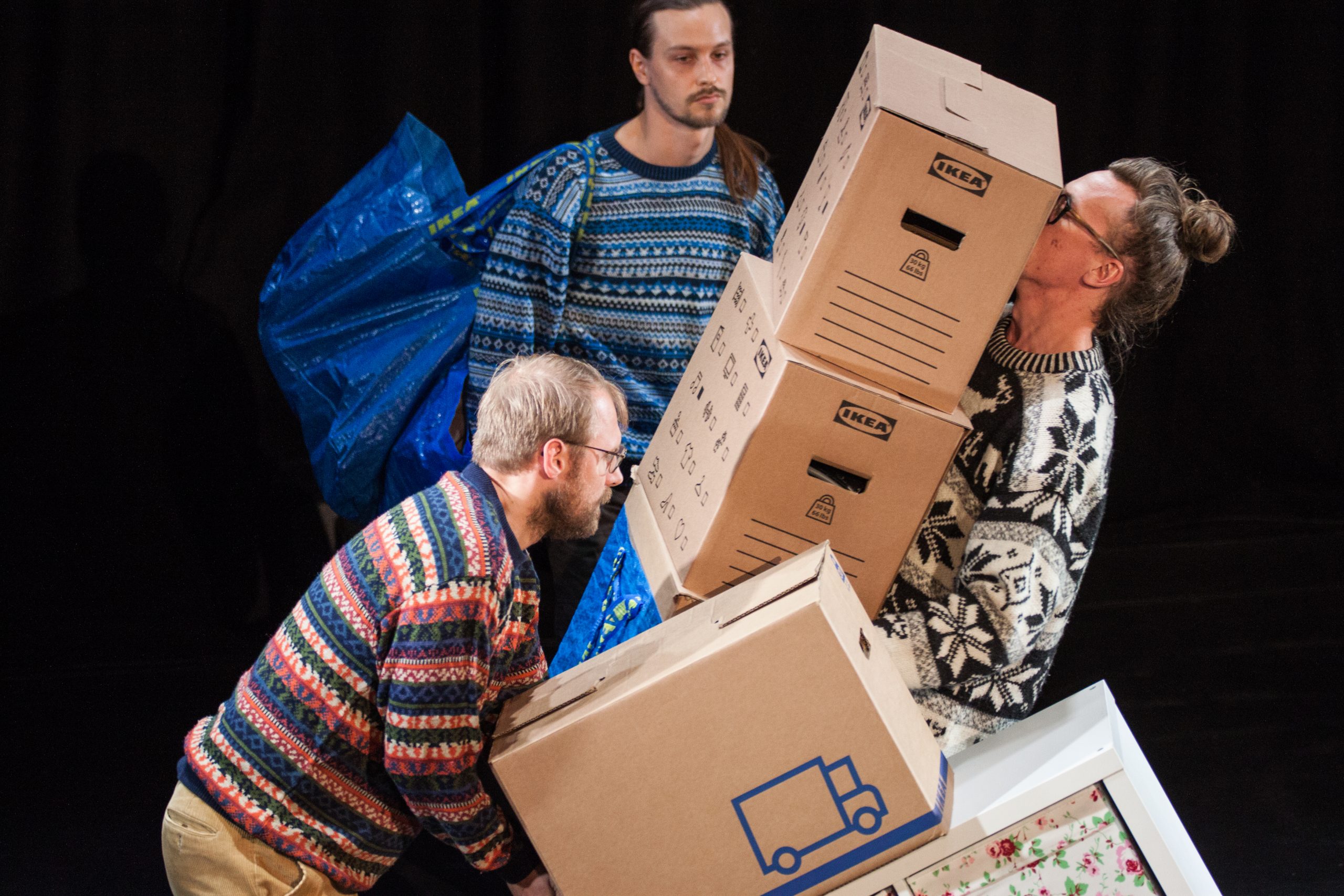 The IKEA KALLAX shelving unit stands at 77 centimetres high. With four square shelves and a variety of muted colours, it’s one of those IKEA pieces you’ll find at probably every single house in Scandinavia. That said—it usually holds books and knick-knacks. You probably haven’t seen it used for acrobatic stunts and ballet choreography, but that’s exactly what audiences found at “Three Men From The North”—one of the biggest hits of this year’s Reykjavík Fringe Festival.