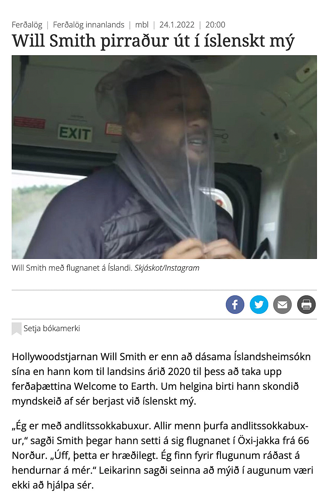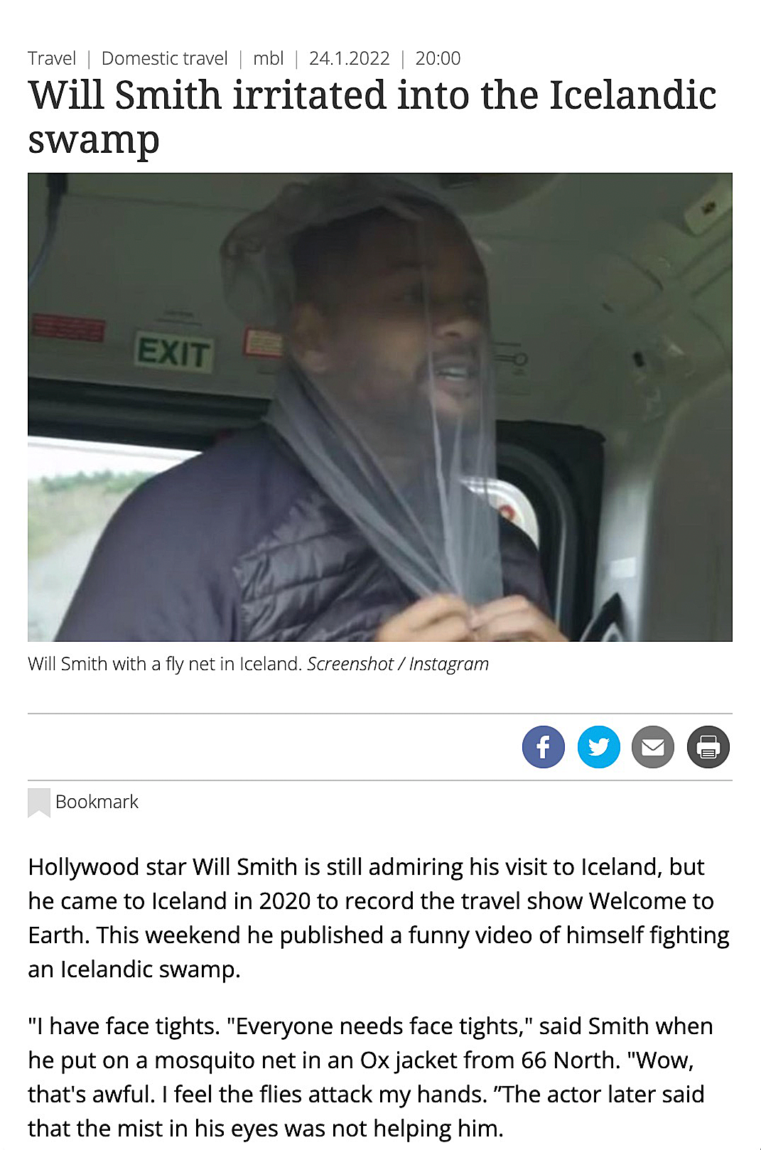Enter Will Smith, or more accurately, this headline about him on the website of Icelandic newspaper Morgunblaðið. The article seems to claim that ‘Big Willy’ was so frustrated while filming his documentary ‘Welcome To Earth’ in Iceland that he went a bit feral, and ended up in an ‘Icelandic swamp’. To make matters even more confusing, further into the column it’s claimed that Mr. Smith actually published a video of himself ‘fighting’ the aforementioned swamp. All of this raises a number of questions. Is the swamp sentient? Can it indeed be fought? Have we somehow witnessed a bizarre extraterrestrial interaction and are about to be neuralyzed by one of Agent J’s Men In Black colleagues any sec–