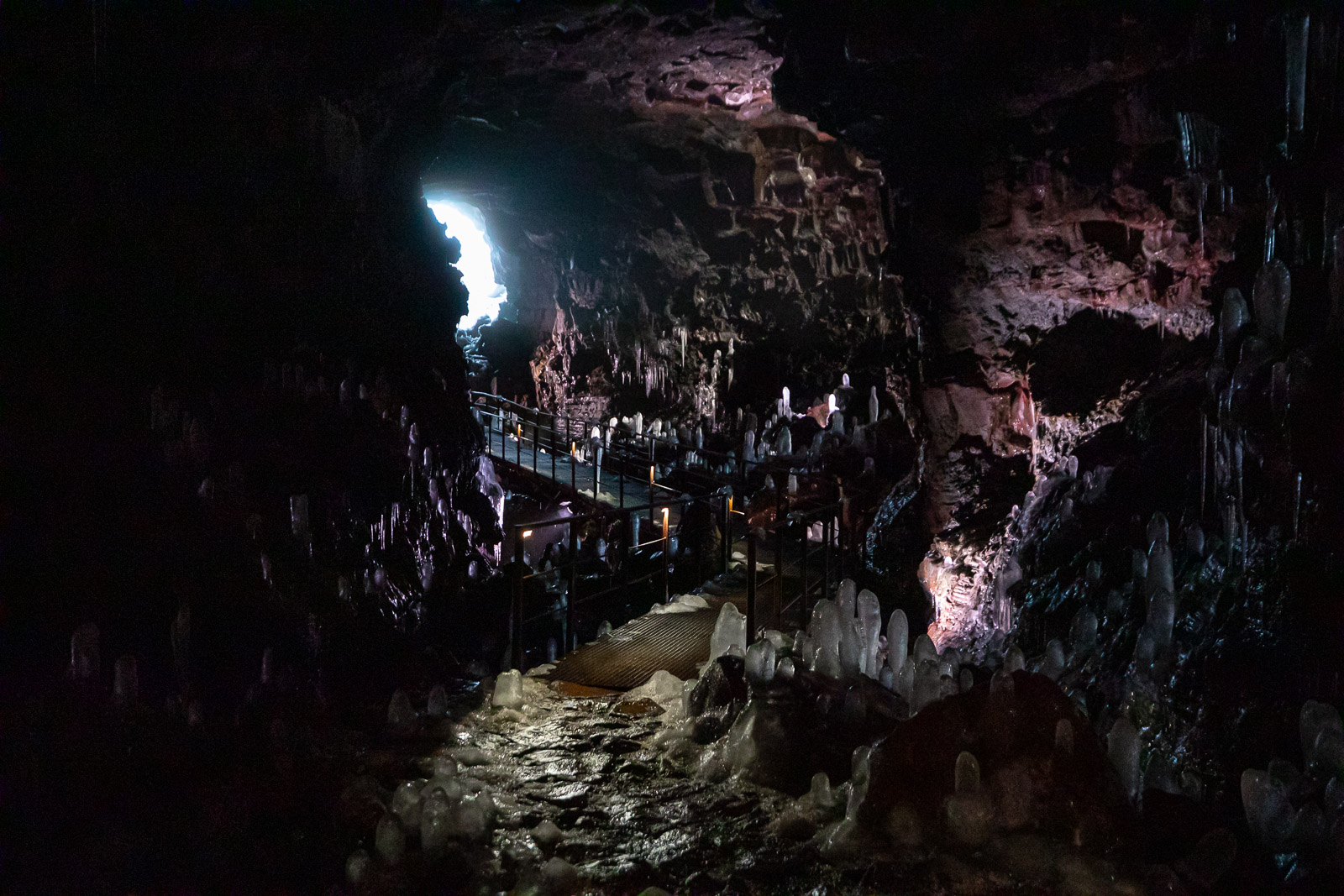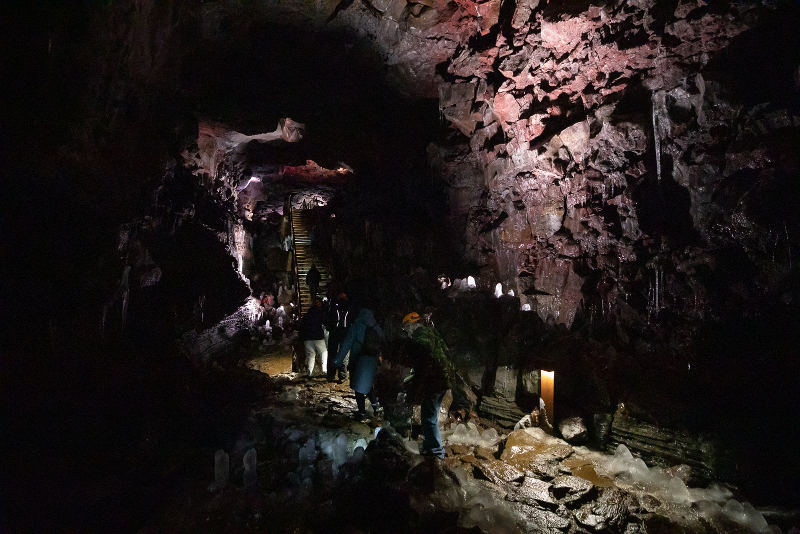 Entering the cave, I was surprised by how cold it was, although we’ve had mild temperatures of 10º Celcius outside. Thanks to the magmatic rocks insulating the cold air, beautiful ice stalactites and stalagmites have formed as water drips from the cave ceiling. This particular phenomenon is only seen during wintertime and it’s quite marvellous to behold. The ice glistened in the light of our headlamps like long cylindrical diamonds.