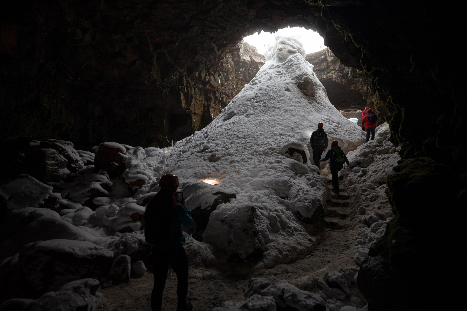 Trusty Grapevine photographer Art Bicnick and I were greeted by our guide Jóna, a geology student who equipped us with a helmet with a headlamp and crampons, because there was quite a lot of snow and ice in the cave in February at the time of our visit. Jóna gave us some last-minute safety instructions and warned us not to lick the walls or relieve ourselves in the cave. Apparently that’s something that needs explaining, since it was done by previous visitors.