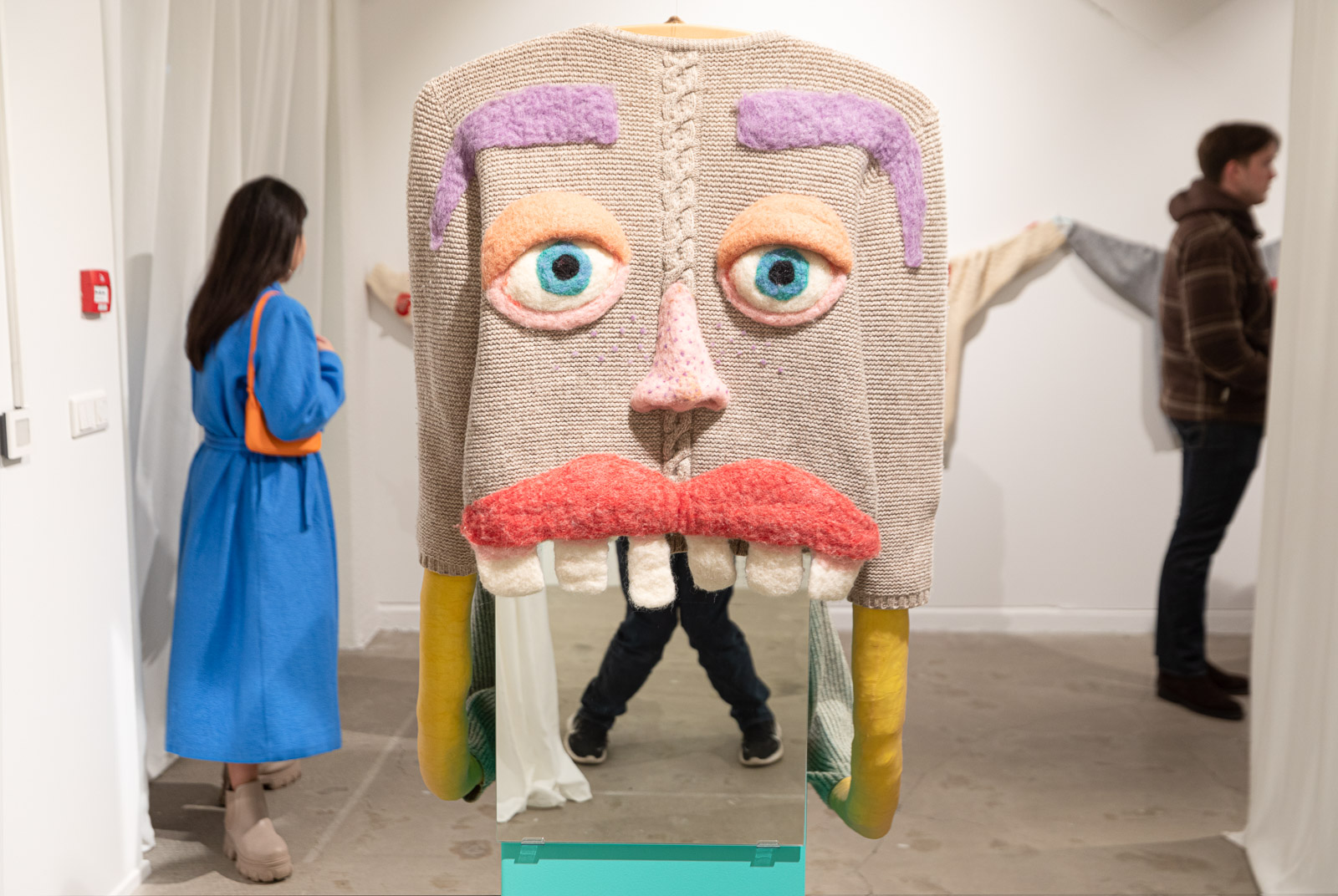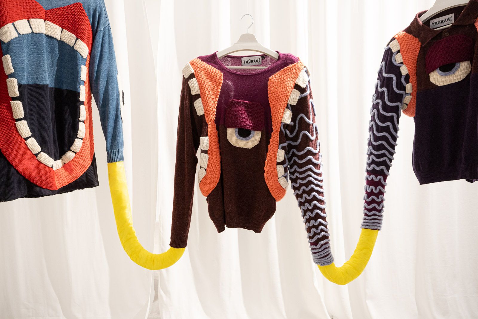 In the meantime, with Nærvera, Ýr and her curators have prepared a funhouse experience — a journey through a colourful maze full of cartoonish textile creations, with each turn revealing a new surprise, including a chance to imagine your own sweater with a nose.
