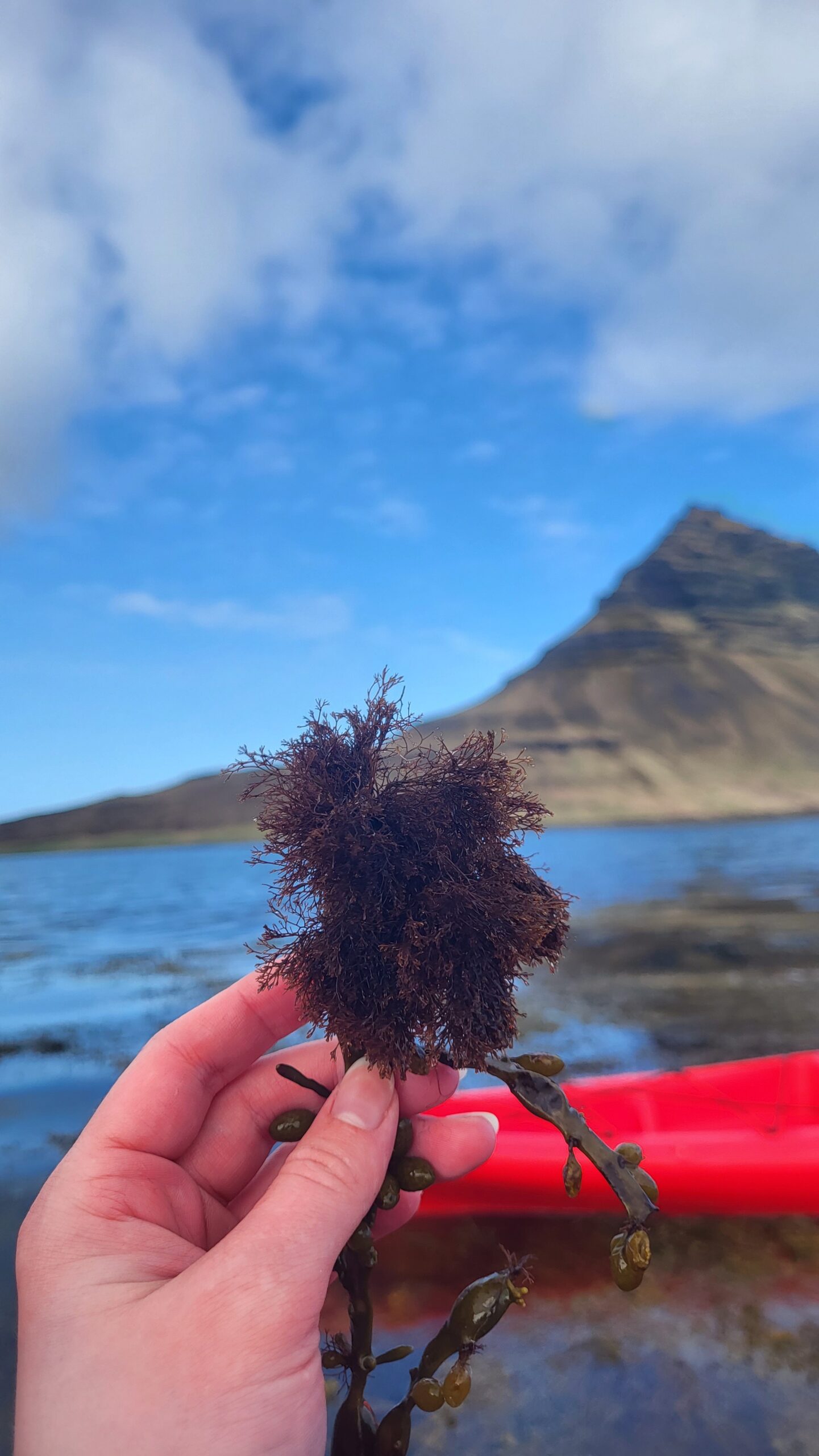 Blue skies, the sun sparkling on the surface of the water, feeling the warmth of the sun on my skin – what a wonderful day for kayaking! On the way back to the basecamp Garðar stopped by some seaweed, ripped it out of the water and gave it to me.