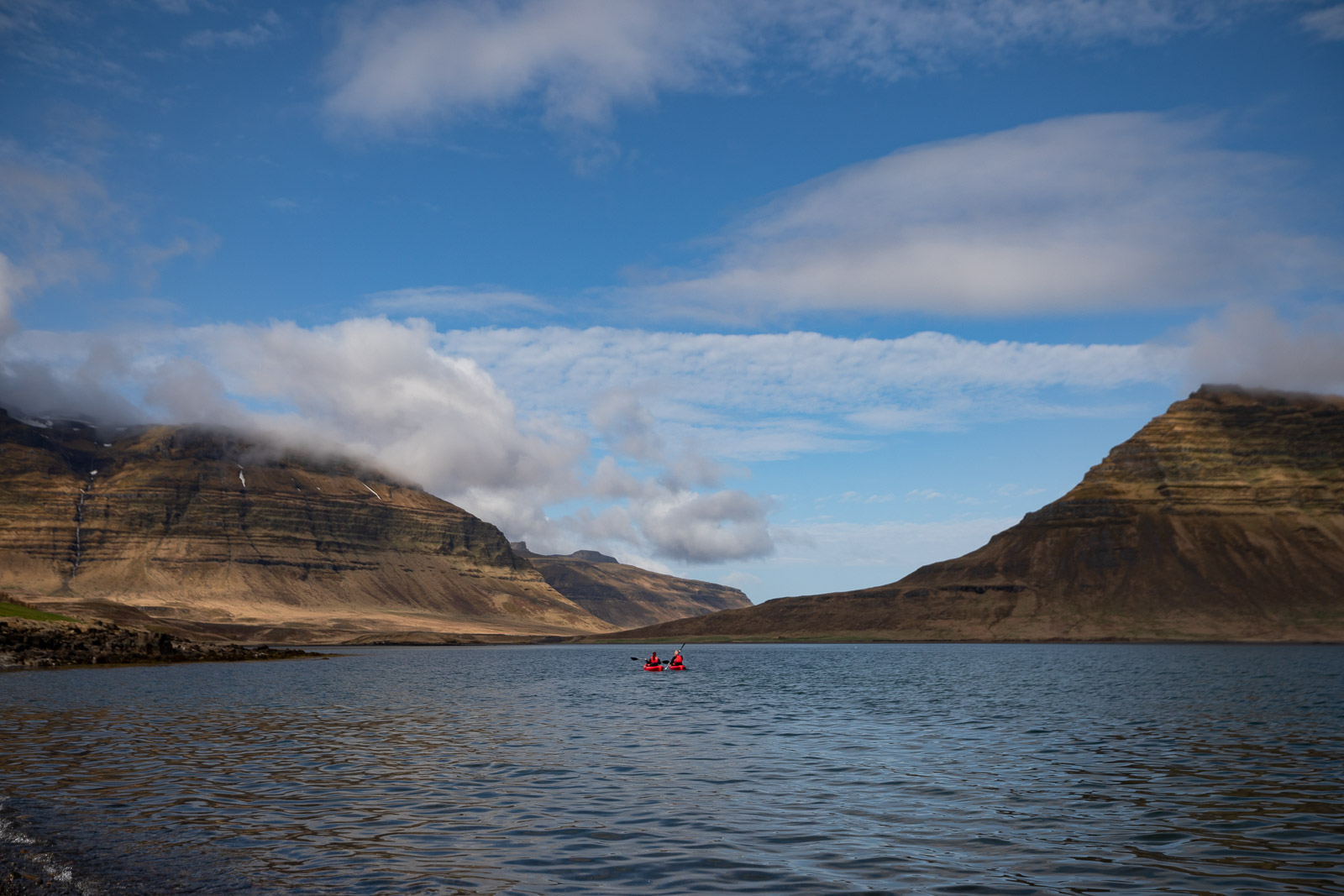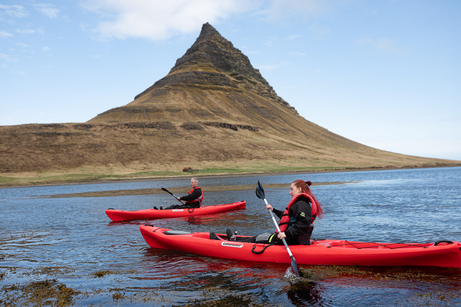 After a short demonstration of how to paddle, we walked down to the beach where our kayaks were already waiting for us. I jumped in my kayak, got pushed into the ocean and started to get a feel for how to paddle myself forward and turn the boat. While kayaking, Garðar informed me about the special landmarks around the area. Obviously, he started by telling me everything he knows about Kirkjufell mountain. Then he went on about a puffin island not far from the coast of Grundarfjörður and the dramatic story surrounding it – I won’t spoil it for you, though, you’re going to have to hear it from Garðar. It was an education being out on the water with someone who is so knowledgeable not only about his home town, but the entirety of the Snæfellsnes peninsula. I stored away valuable tips about the must-sees in my memory for my next trip west.