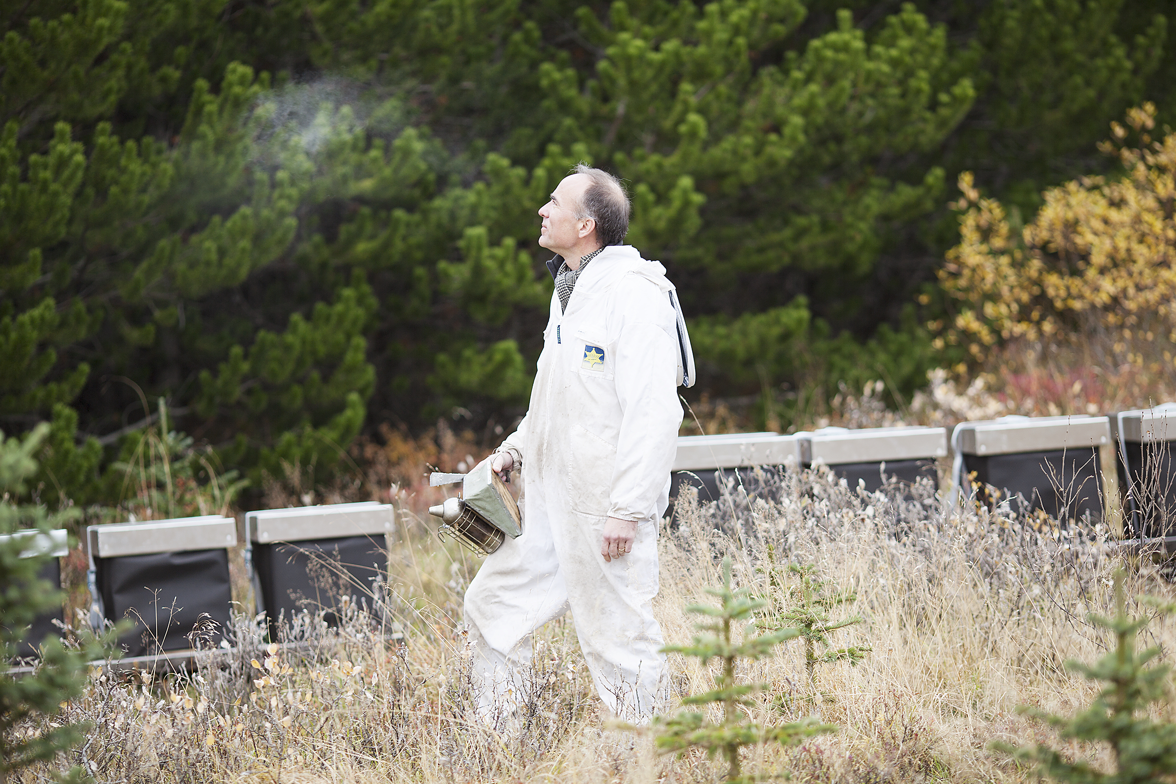 We pull up to a modern cabin that couldn’t be more than two rooms, set behind a patch of thin pines and tea-leafed willow. From there, it is a short walk to the hive. It can be heard well before it’s seen—the distinct hum that would, under most other circumstances, have sent me in the opposite direction.