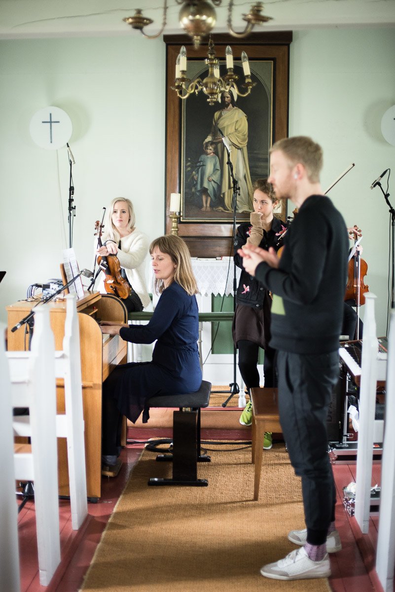 Holtskirkja is a beautiful little church, set amongst the green grass and vast mountains of Önundarfjörður’s southern shore. Upon our arrival, we’re delighted to discover that Dagný and Reverend Fjölnir have already prepared food and coffee. As the crew sets up for filming, the string players tune their instruments, creating a warm and homely atmosphere.
