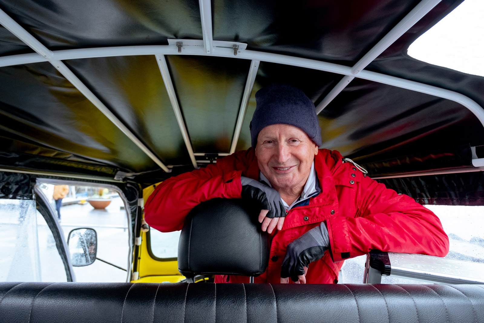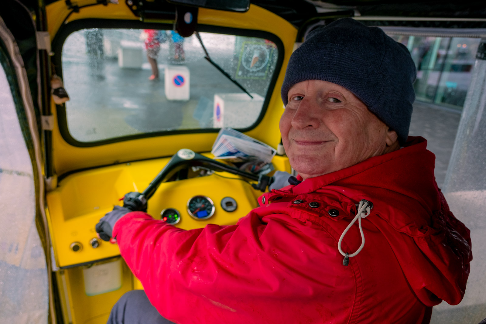 My favourite thing is getting out and about, meeting people and not acting like an old retired guy. The thing that I don’t like the most is the weather. It’s too fickle; it changes every hour. I had no appetite to go out on a day like today — rainy, windy, grey. Because the passengers would be unhappy. When we go out when it’s sunny, it’s great, and obviously people’s moods are better. If it’s a day like today, it’s just not very appetising to go out and walk around. Last week, we had everything but snow. It’s been a bit insane. What a lousy summer it’s been weather-wise!