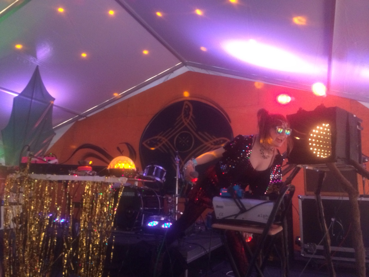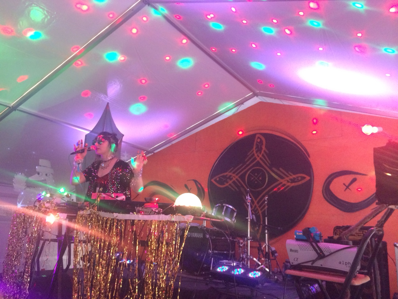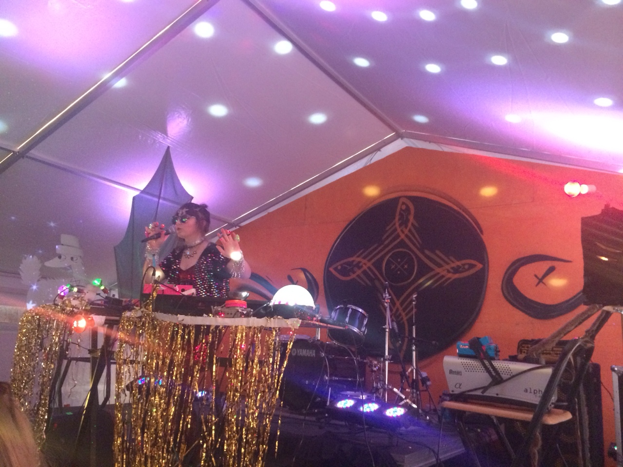 After Berndsen came the equally entertaining dj. flugvél og geimskip (“DJ Airplane and Spaceship”). Decked out in lace tights, endless sequins, and chunky sandals, she stomped around the stage precisely arranging her set just so—a touch of metallic streamers here, a disco ball there, a mini fog machine here, a giant cardboard cartoon something-or-other over there, and some lit incense to spread all around the crowd. Flugvél gives off an appropriately spacey overall persona, and the whole set was very zany and DIY in a way that tickles that childhood part of me that gets excited about turning a cardboard box into a spaceship for the day or something. Imagination—I think that’s the word.